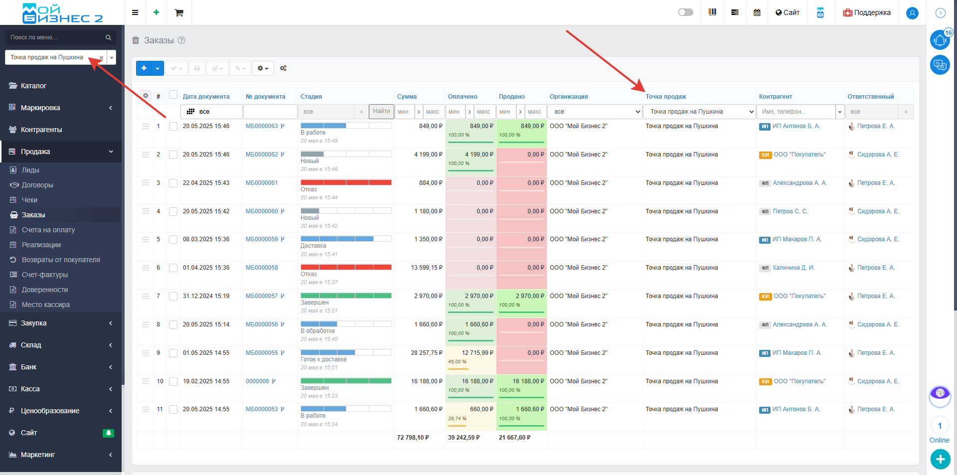 После выбора точки продаж "На Пушкина" система автоматически фильтрует все данные: