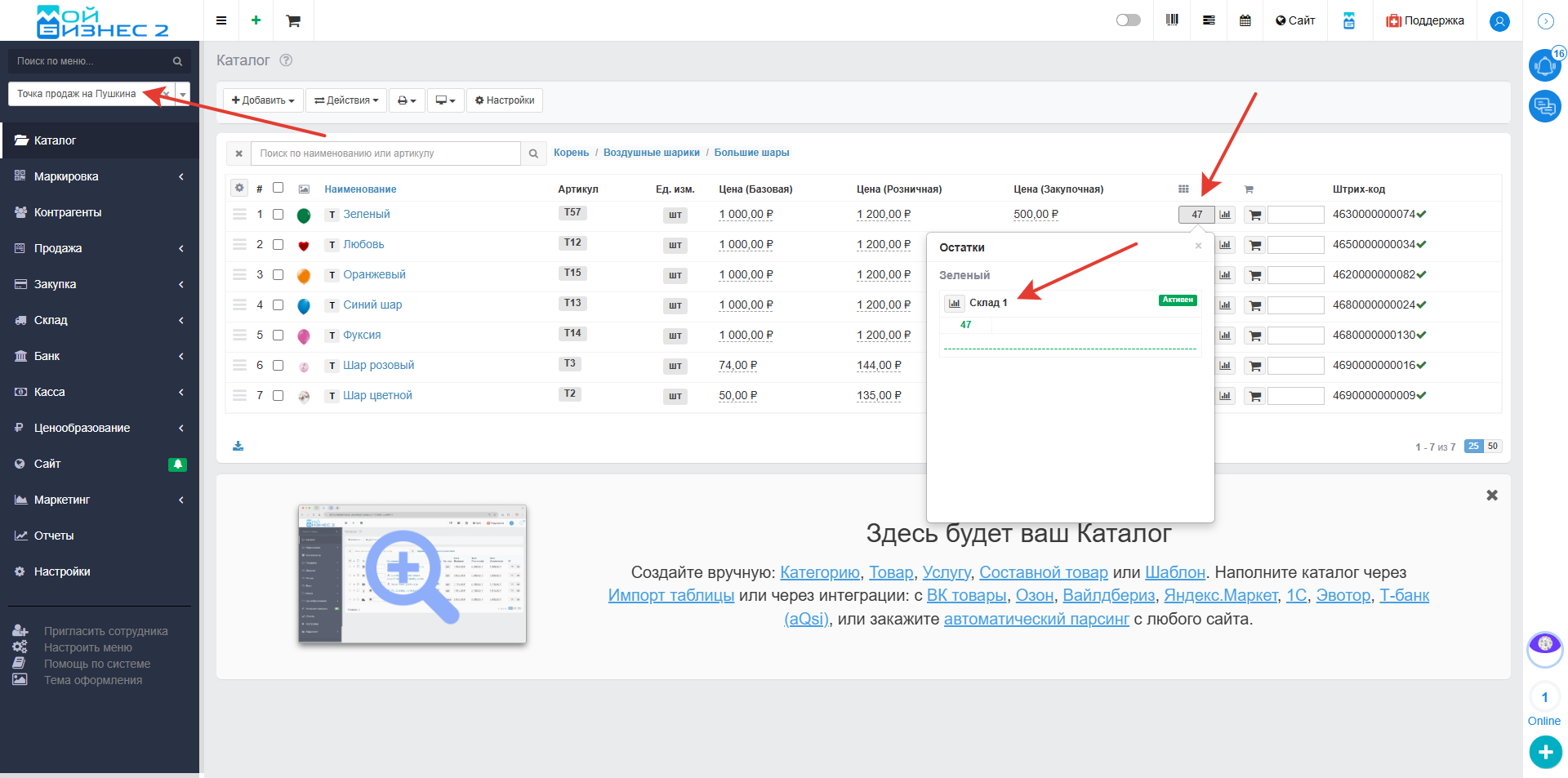 "Основная структура" каталога будет связана с "Точкой продаж на Пушкина"