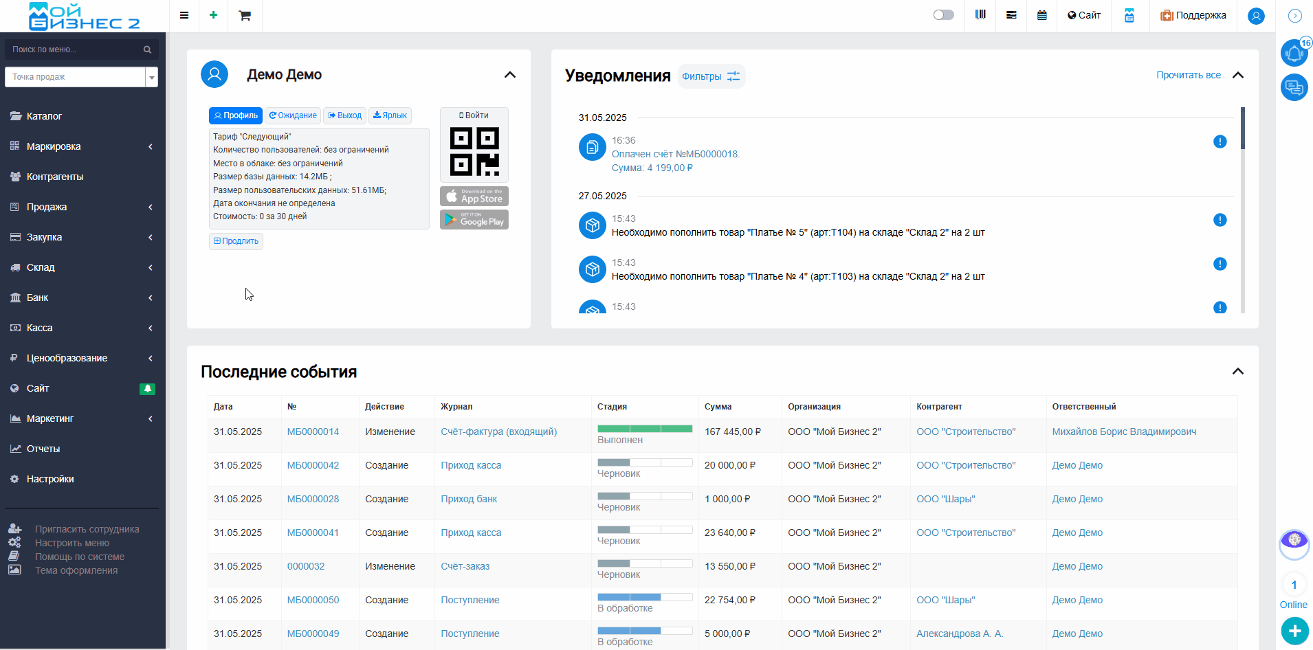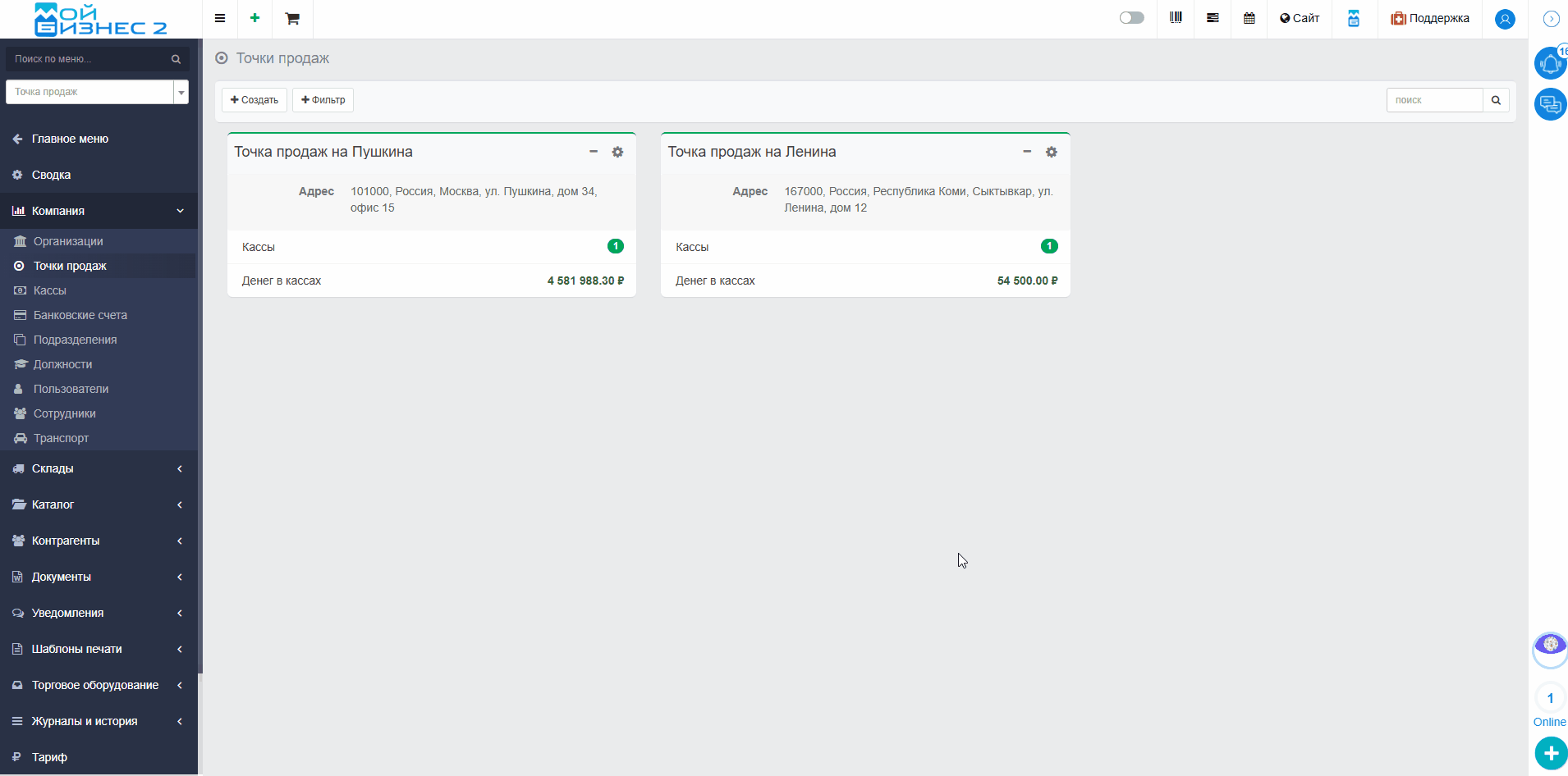 Вывод: таким образом, в МойБизнес2 с помощью глобального фильтра точек продаж вы можете одновременно отфильтровать все документы, остатки и каталог согласно выбранной точке.