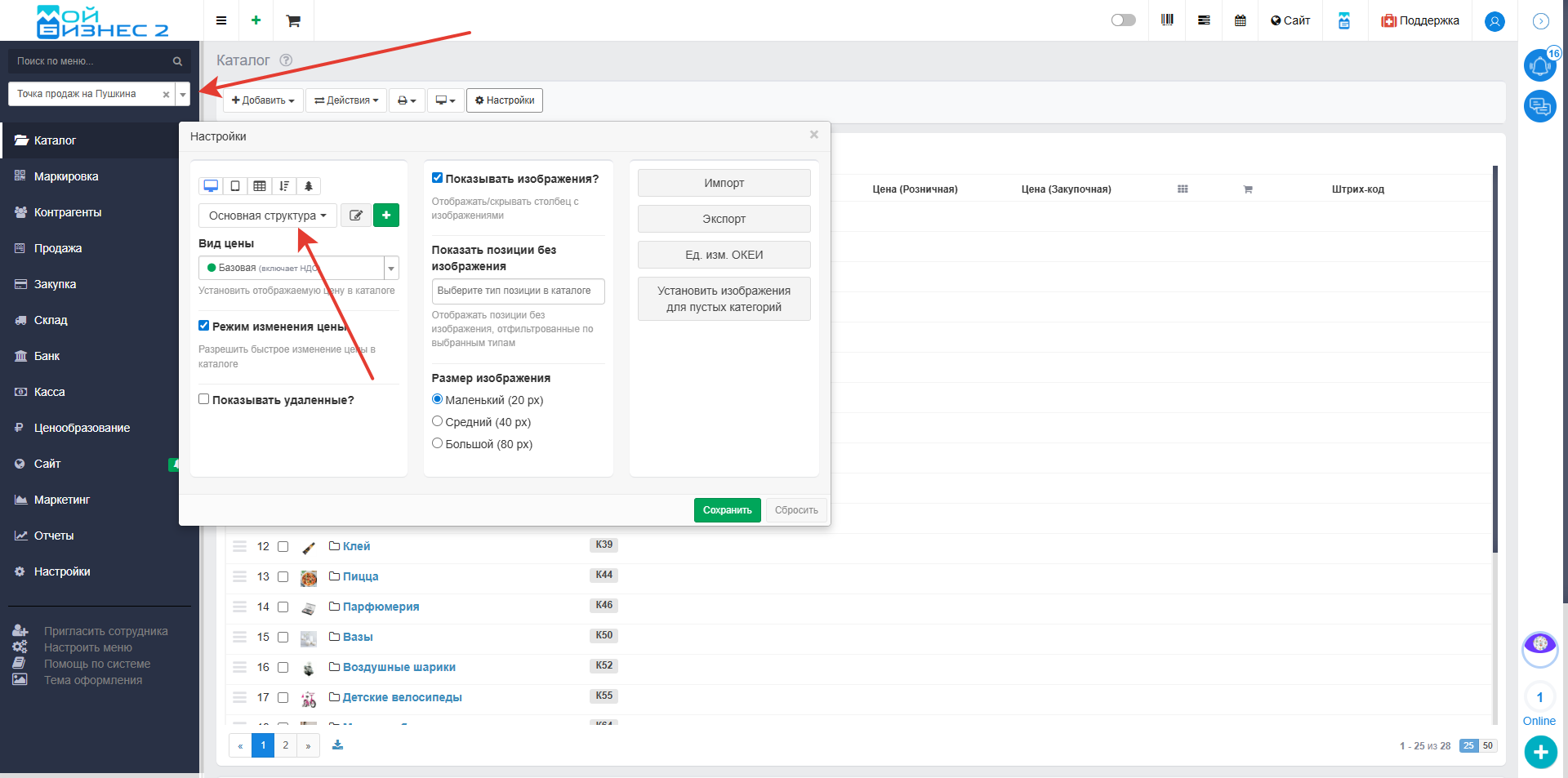 При переключении на точку продаж "На Пушкина" сотрудник видит в каталоге только основную структуру товаров