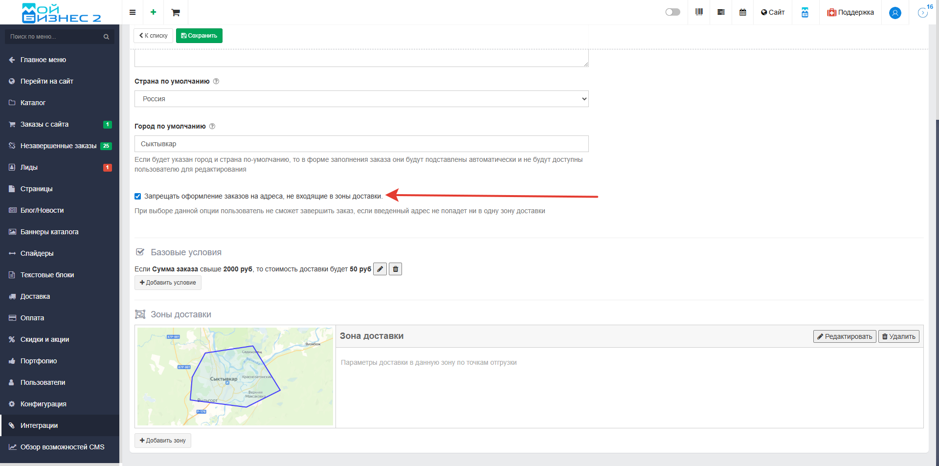 Скрин - функция запрета оформления заказов на адреса, не входящие в зоны доставки