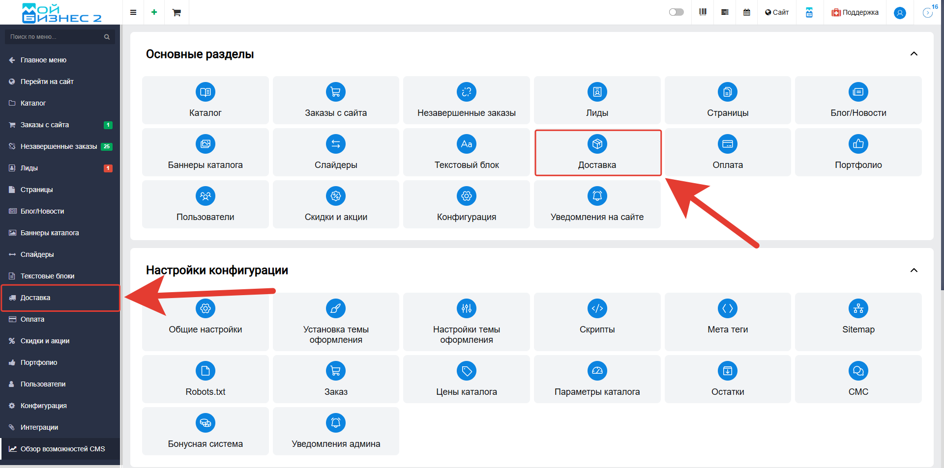 В МойБизнес2 есть возможность настроить способы доставки, включая самовывоз, СДЭК доставку, доставку до получателя и до почтового отделения.
