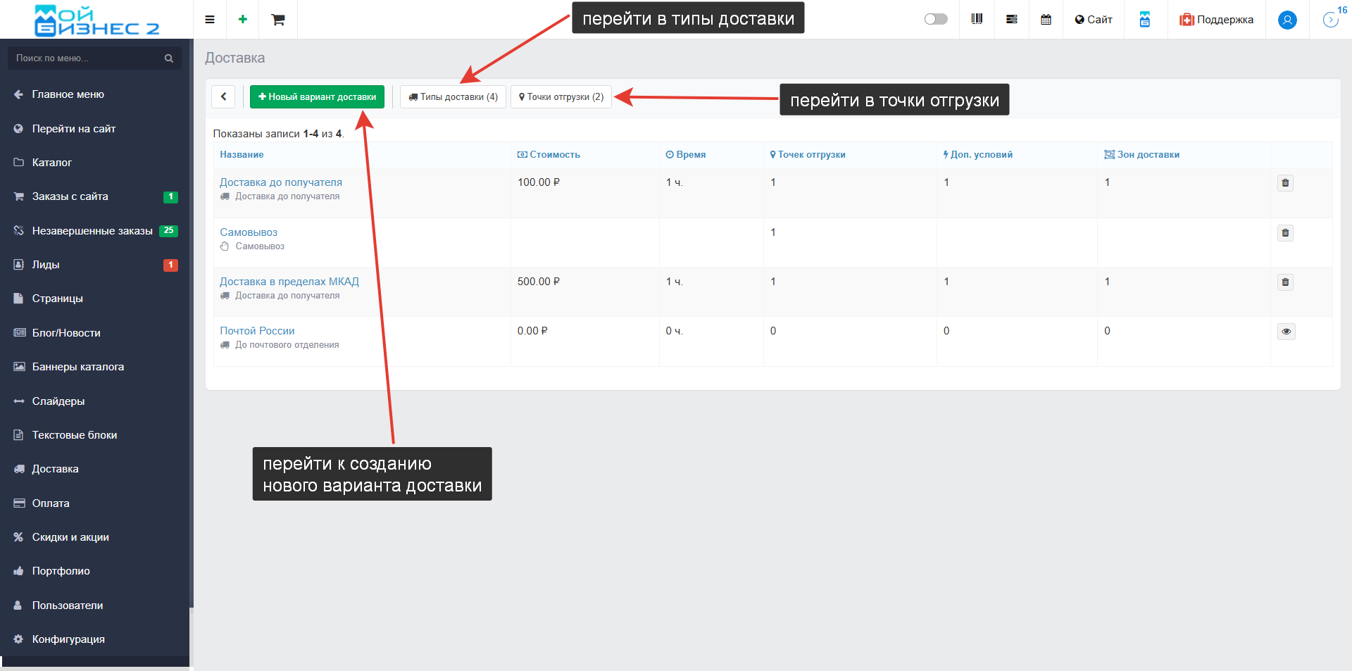 Вывод: настраивать способы доставки в МойБизнес2 очень удобно. Для настройки способов доставки необходимо создать: вариант доставки, тип доставки, точки отгрузки и заполнить все необходимые поля.