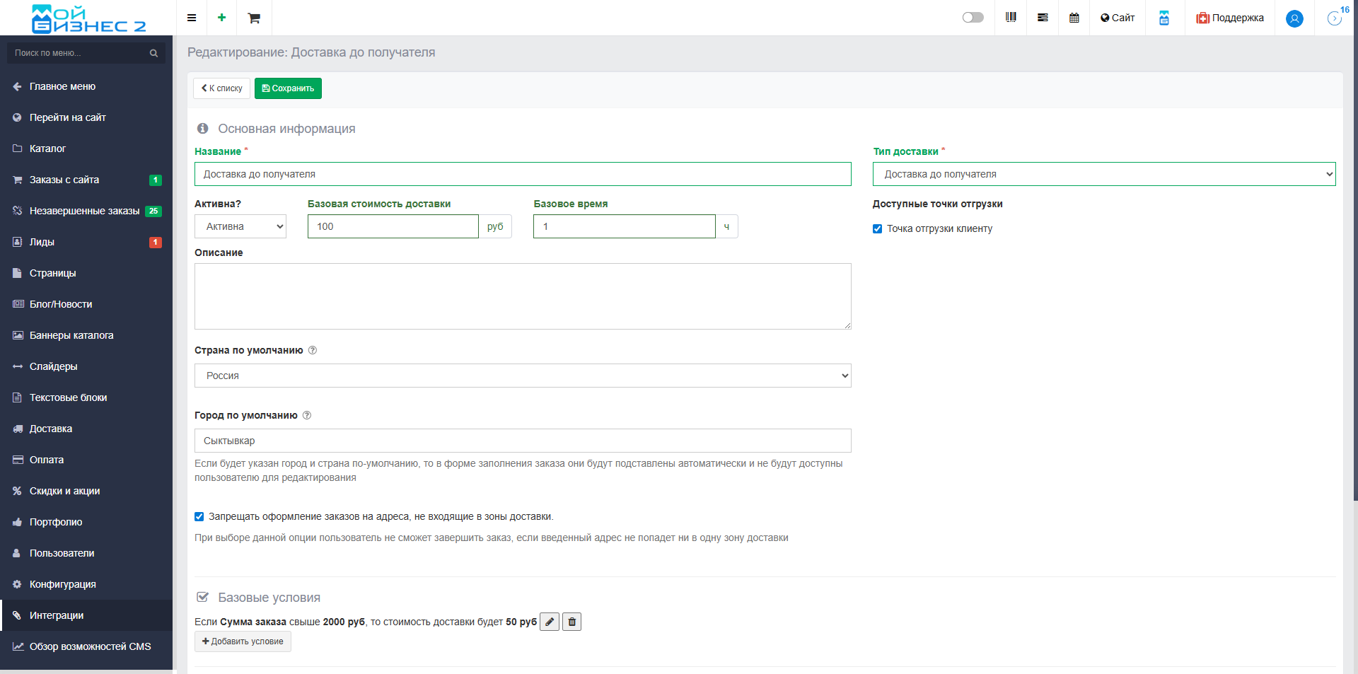- Базовые условия - указываем базовые условия доставки. Если указаны базовые условия, то сумма доставки будет рассчитана, исходя из этих условий. Например: если сумма заказа свыше 500 руб, то доставка = 0;