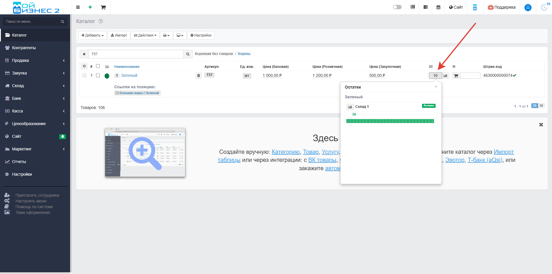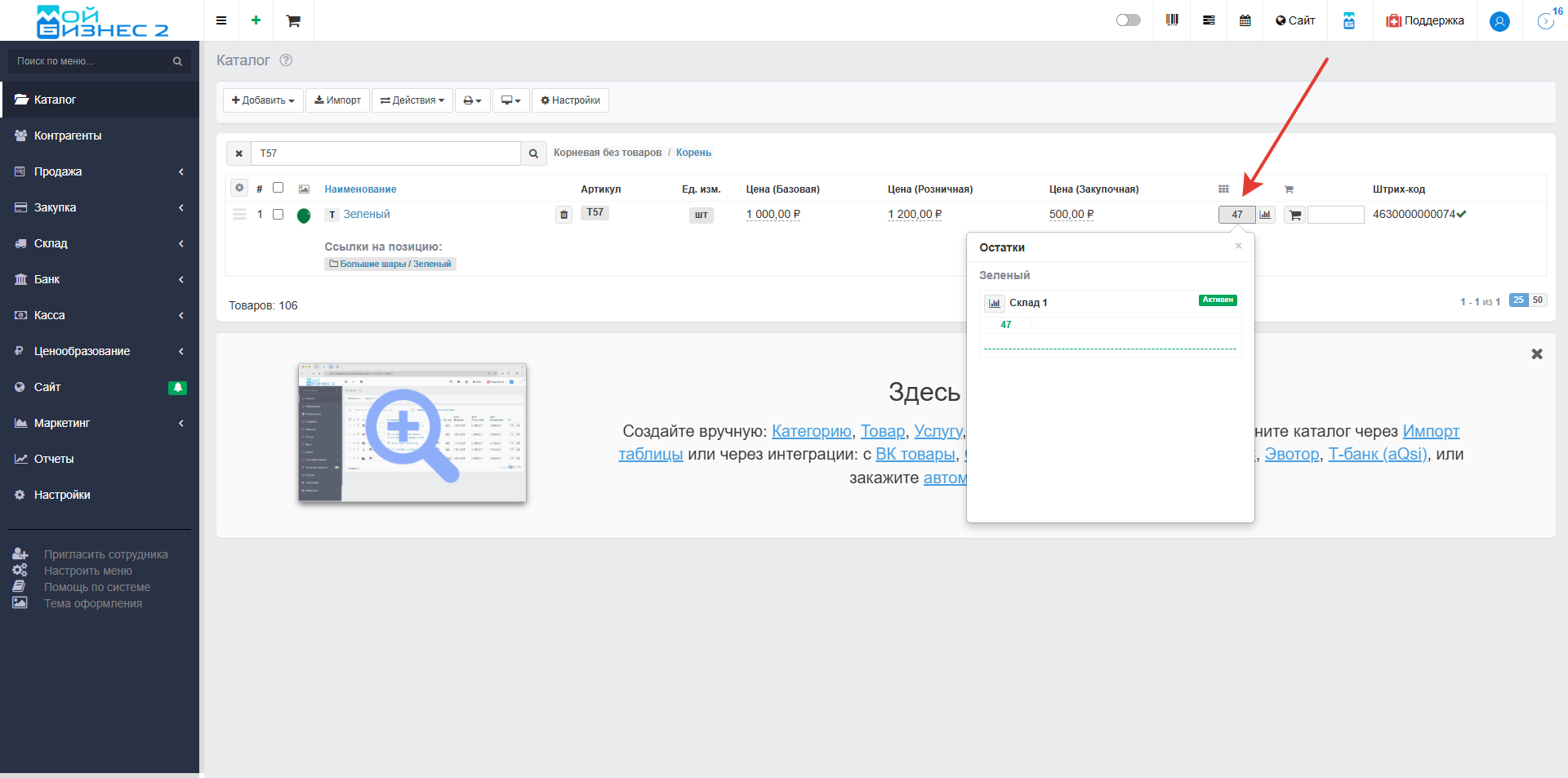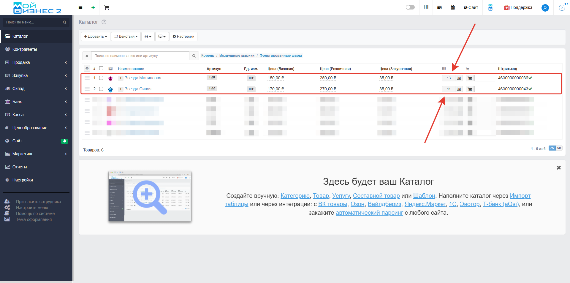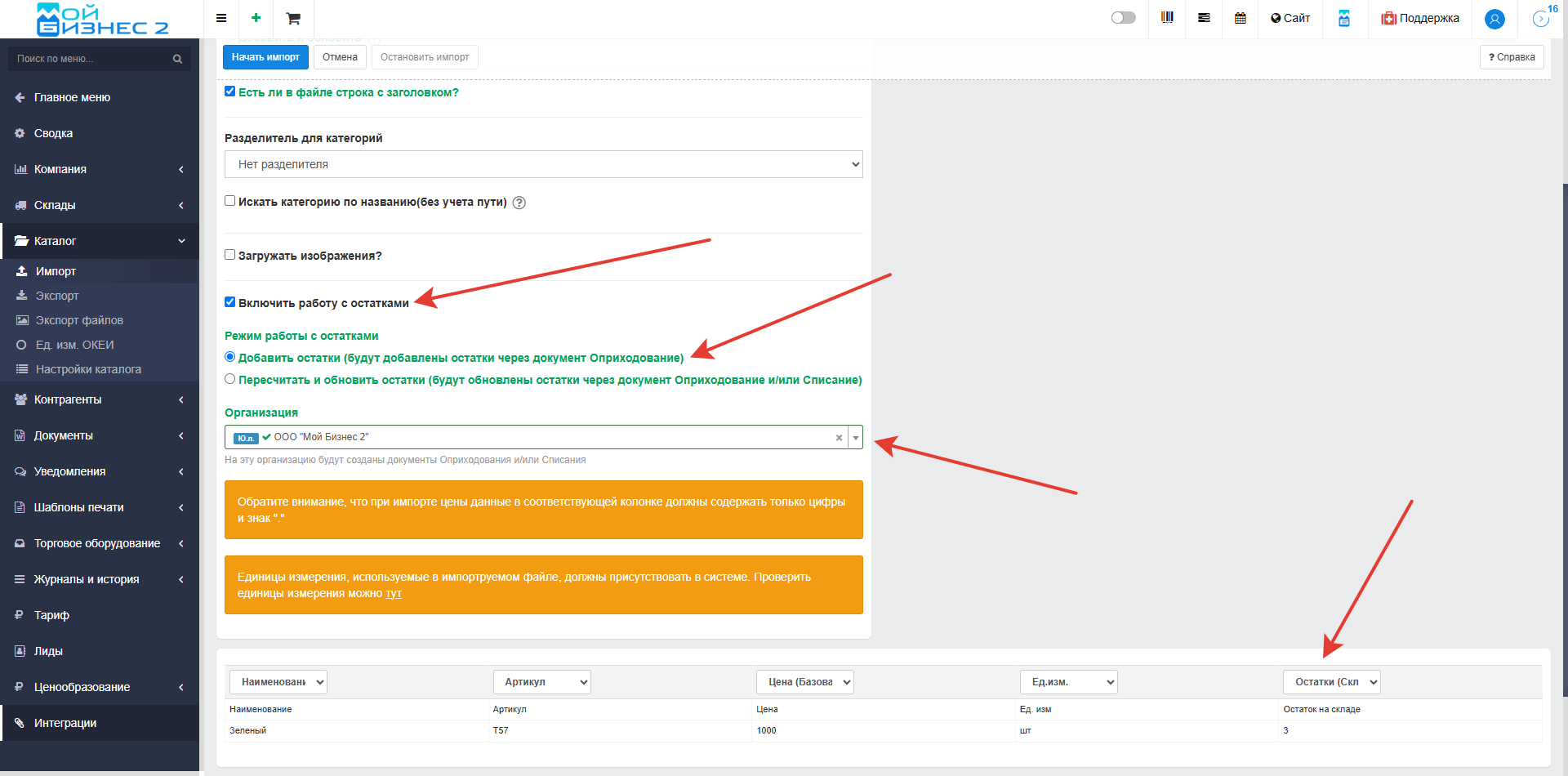 Вывод: таким образом, в МойБизнес2 можно пополнять и обновлять остатки товаров на складе с помощью импорта каталога.