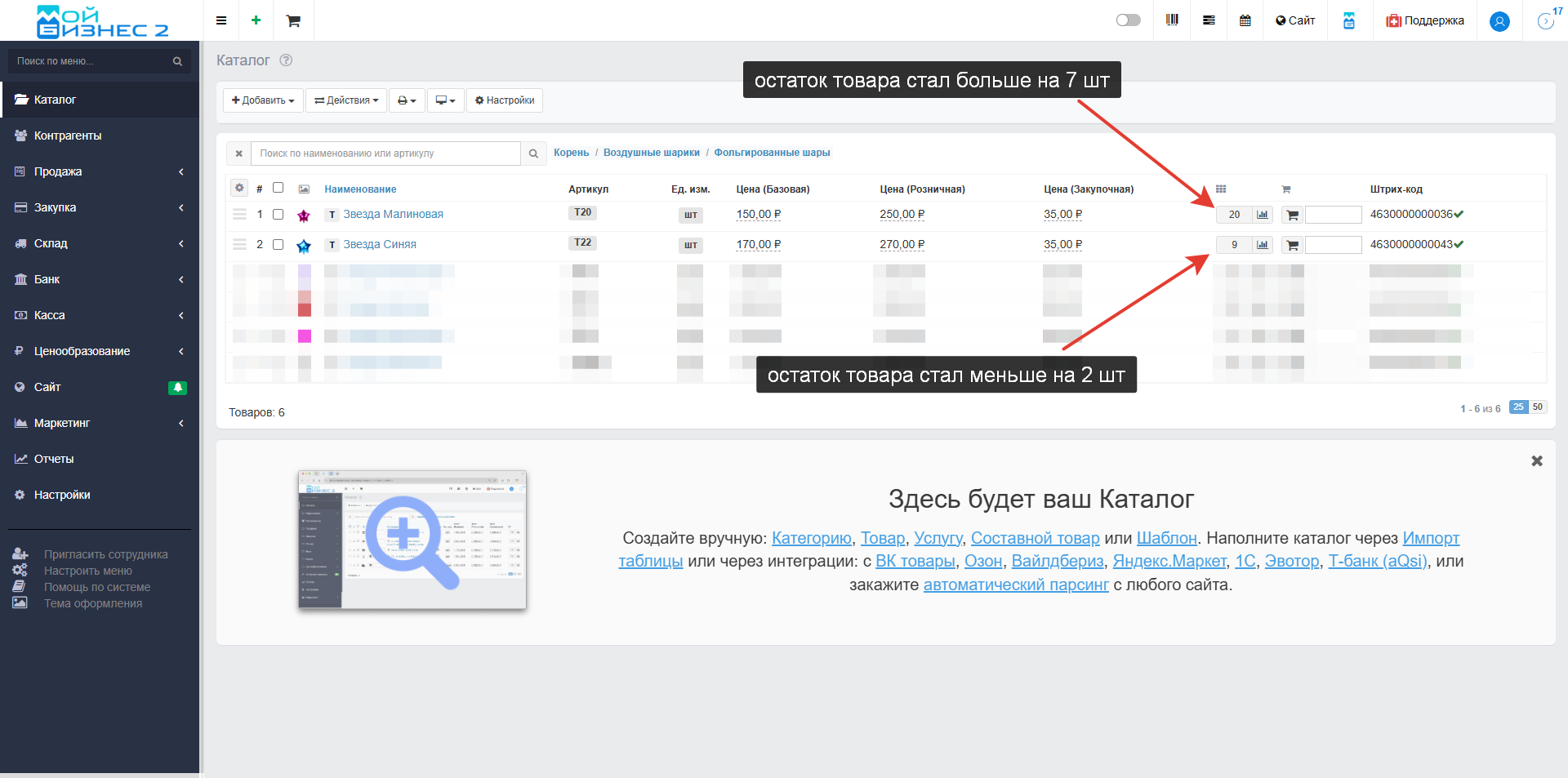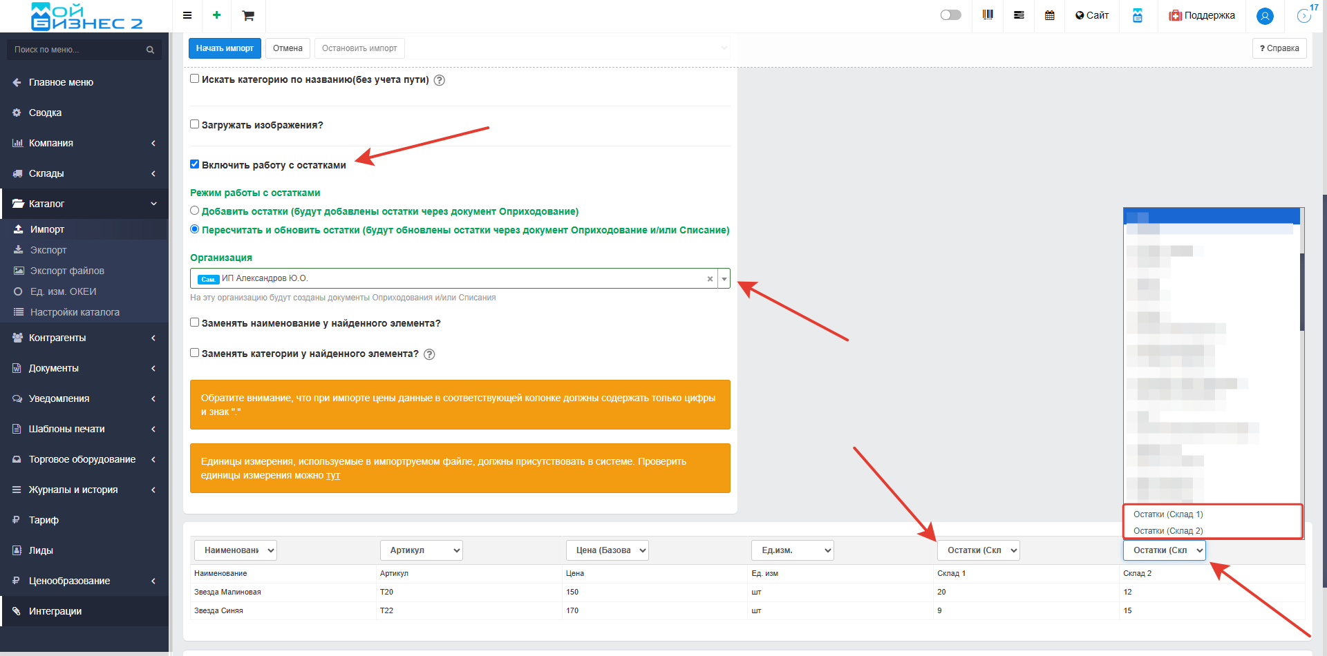 В МойБизнес2 реализована функция управления складскими остатками с помощью импорта каталога. Теперь вы можете выбрать одну из двух операций: