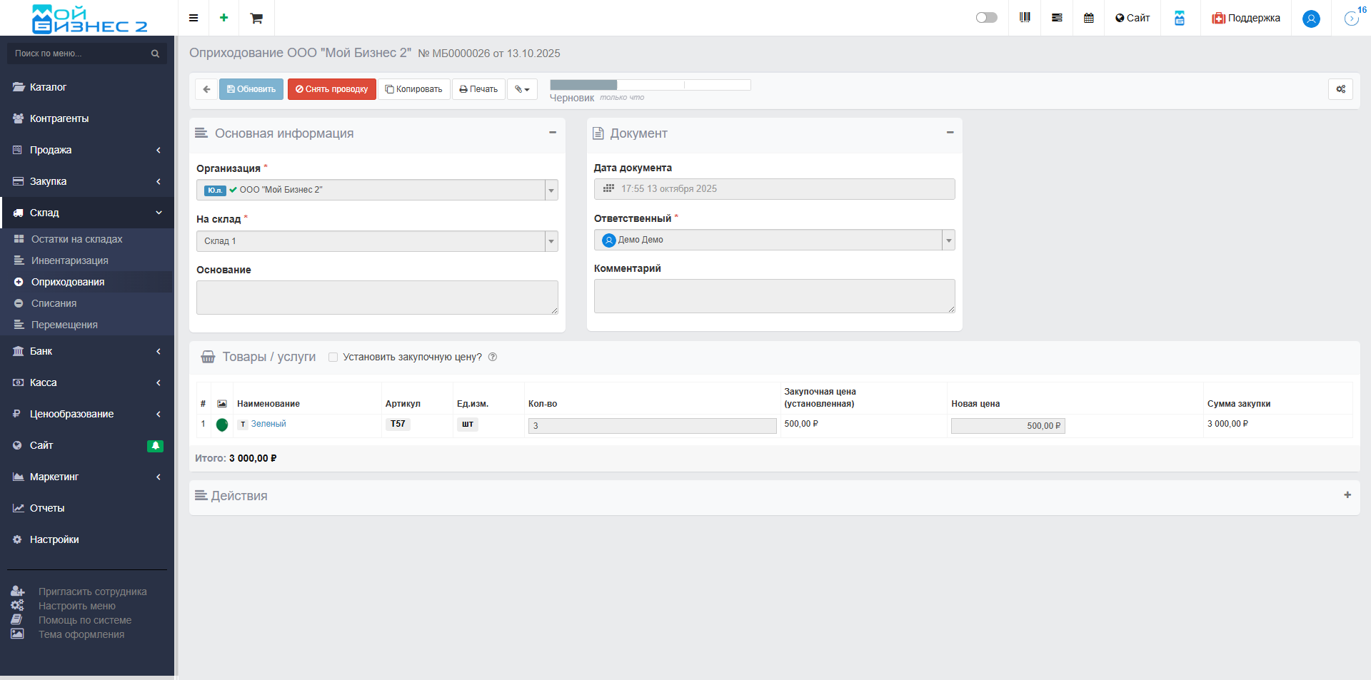 4) После завершения импорта создался документ "Оприходование" с верным количеством пополнения товара - 3 шт :