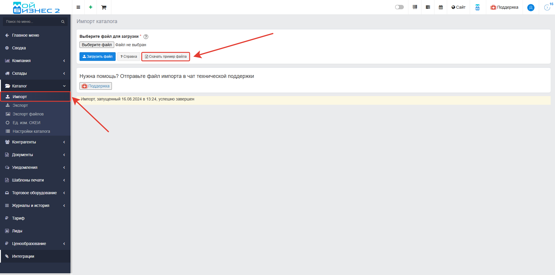 Чтобы начать импорт каталога, перейдите в раздел Настройки → Каталог → Импорт. Данные загружаются с помощью таблицы в формате XLSX или CSV. Шаблон файла с примером заполнения вы можете найти на странице импорта.