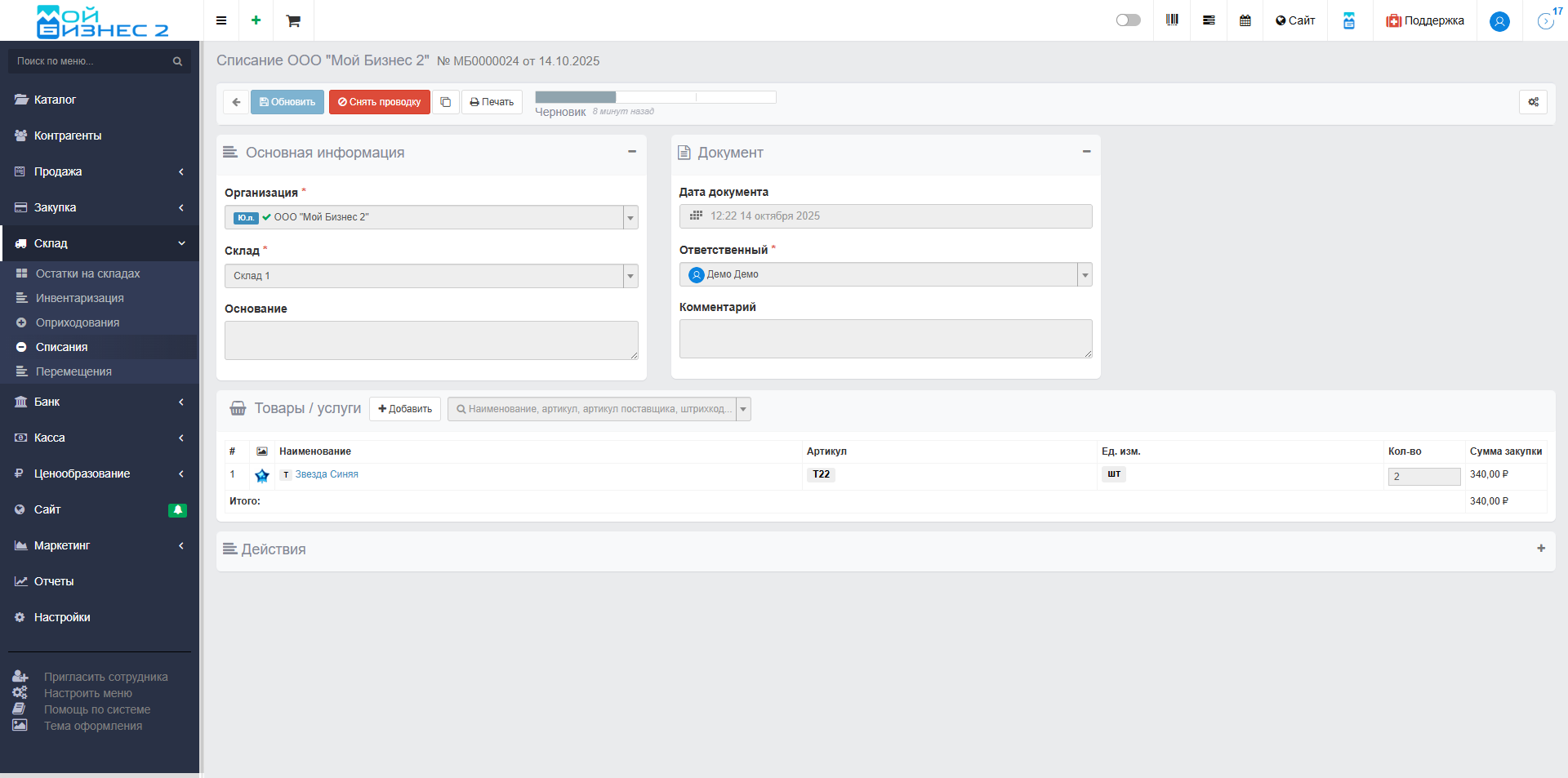 2. "Списание" - с количеством списания второго товара - 2 шт :