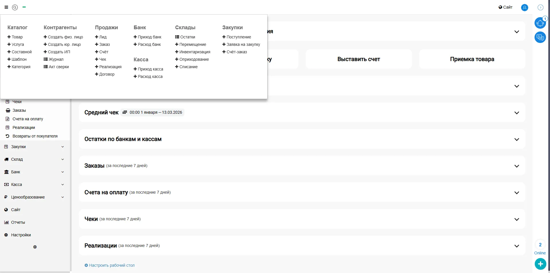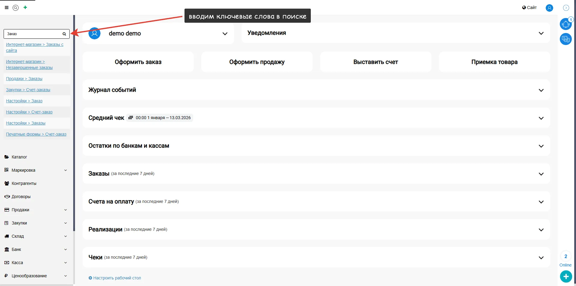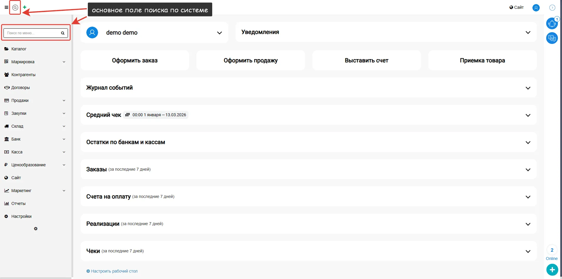 В МойБизнес2 существует множество различных журналов и документов, при помощи которых происходит деятельность бизнеса. Однако, новому пользователю не всегда понятно, где что находится. Поэтому в рамках настоящей статьи мы расскажем, как работает поиск, а также каким образом можно настроить основное меню.