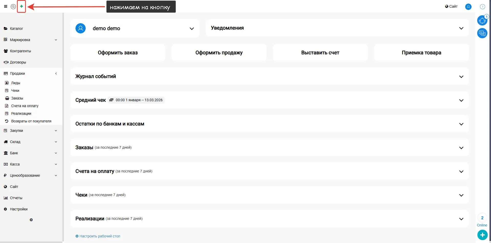 Стоит напомнить, что в системе МойБизнес2 можно быстро создавать документы, минуя их поиск. Для этого на верхней панели реализован зелёный "+", нажимая на который открывается окно, где выбирается соответствующий документ.