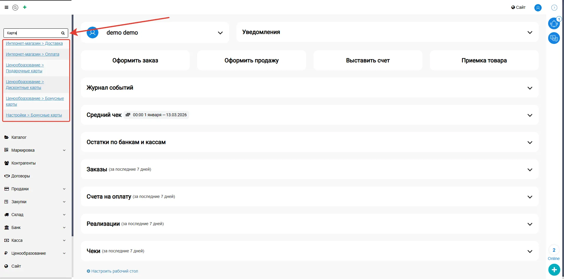 Поиск и настройка меню в МойБизнес2
