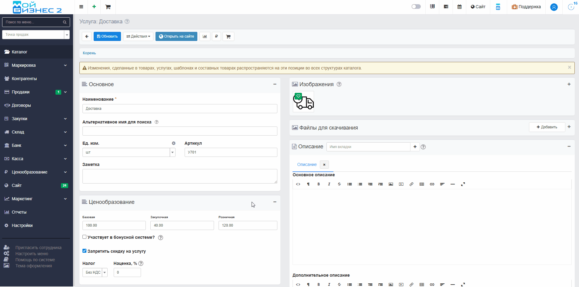Вывод: таким образом, в МойБизнес2 можно настроить режим налогообложения, установить НДС в карточке товаров и применять его в документах.