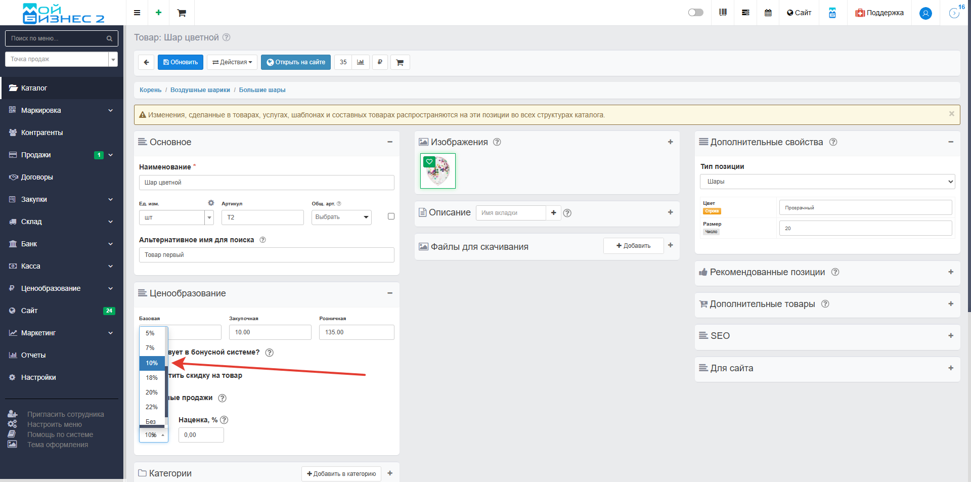 Переходим в карточку товара и в блоке Ценообразование указываем нужный процент НДС. Например - 22%.