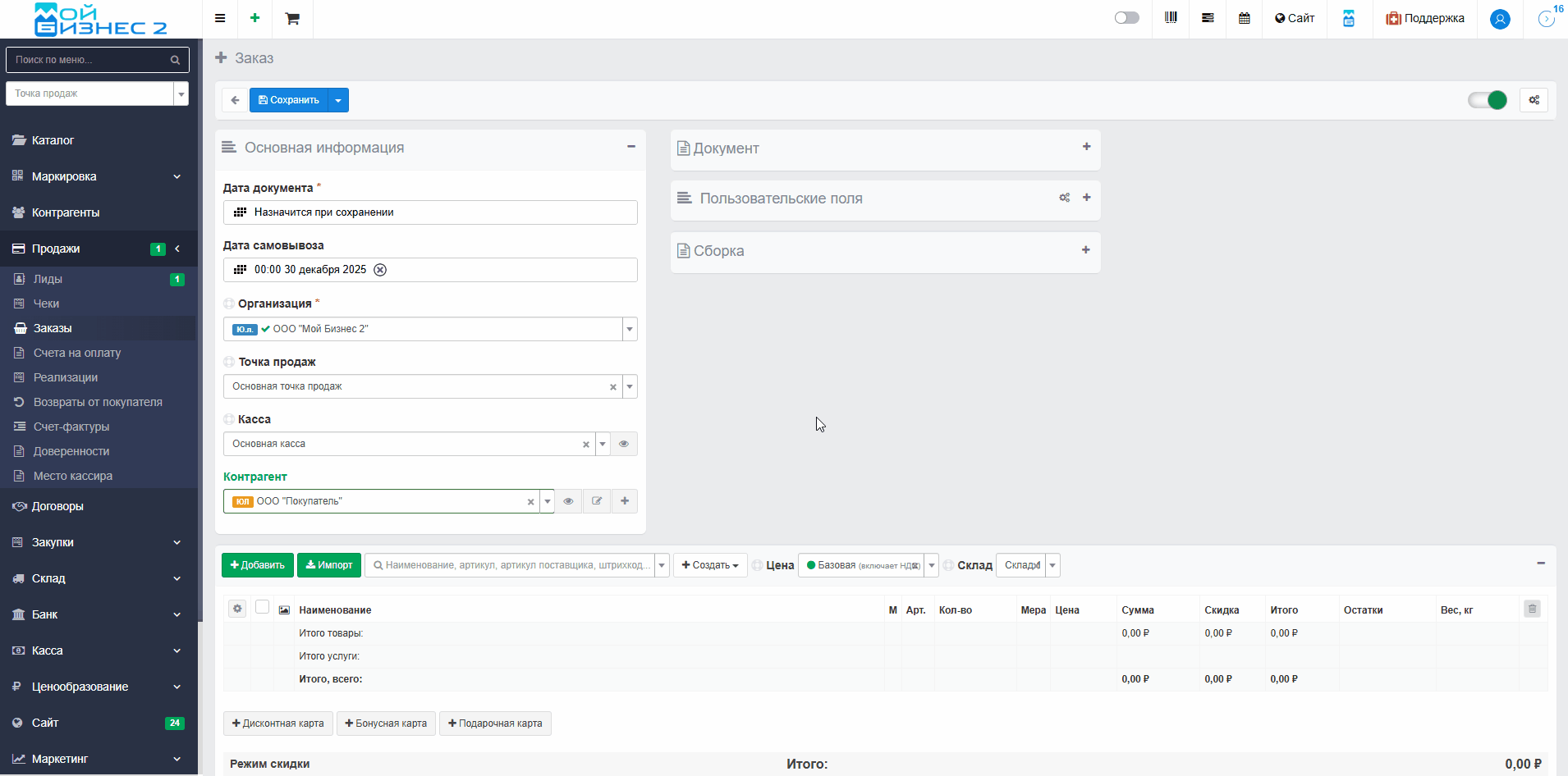 Теперь, когда мы установили НДС для каждого вида товара, давайте проверим, как это работает при создании документа Заказ. Создаём заказ, заполняем все необходимые поля и добавляем товары. Видим, что НДС автоматически применяется к каждому товару.