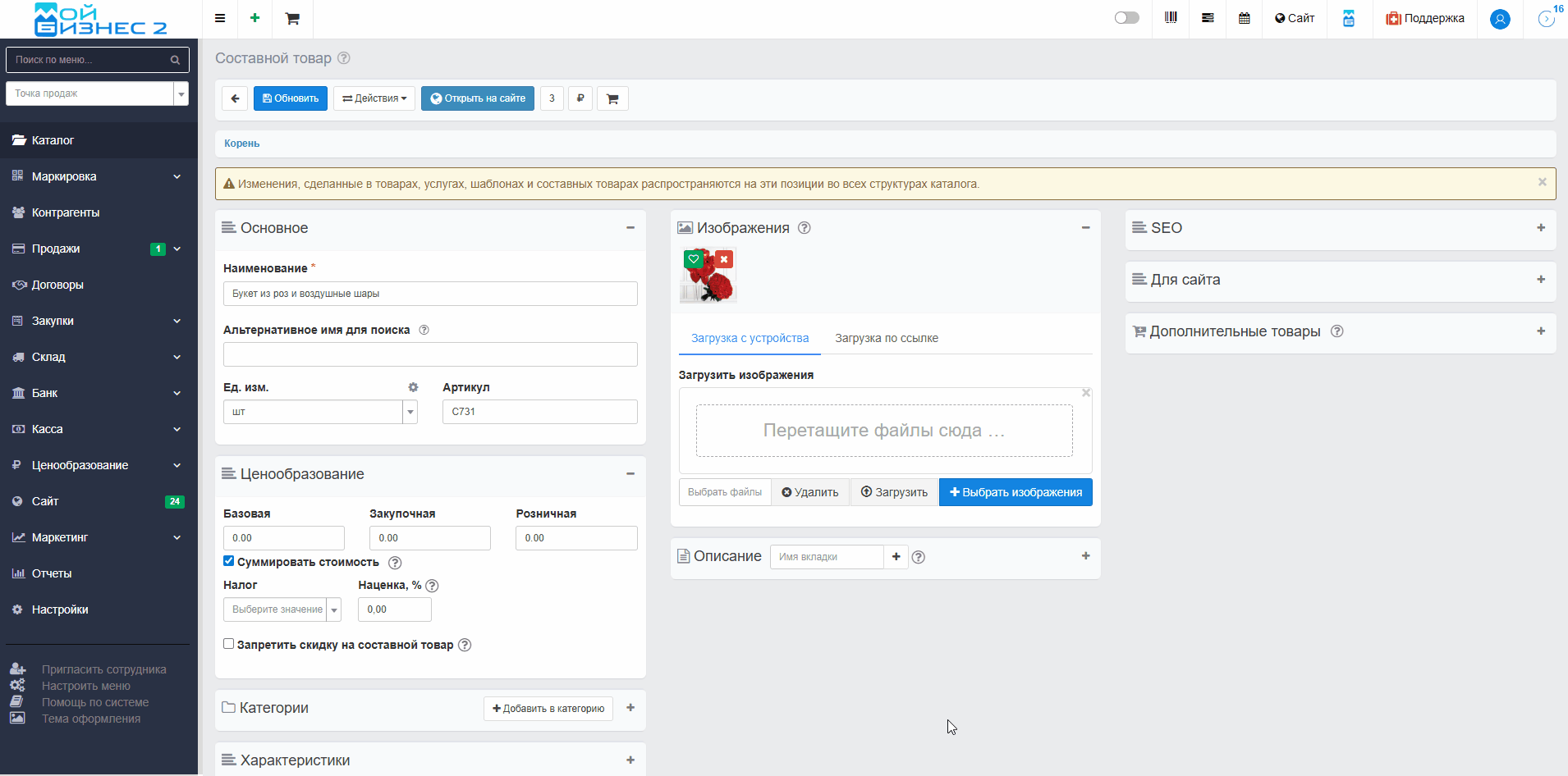 В отличие от шаблона, в составном товаре можно установить НДС. Переходим в карточку составного товара и в блоке Ценообразование устанавливаем нужный процент НДС.