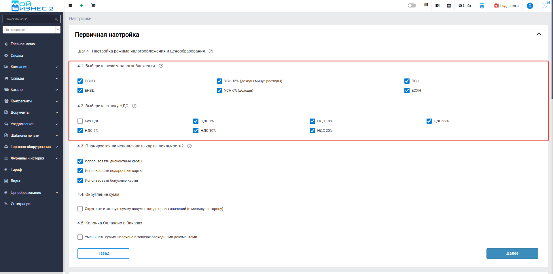 Чтобы НДС можно было установить, в первичной настройке необходимо первым делом выбрать режим налогообложения из всех возможных вариантов: 5%, 7%, 10%, 18%, 20%,22% или "Без НДС". Стоит отметить, что можно выбрать сразу несколько режимов или все сразу.