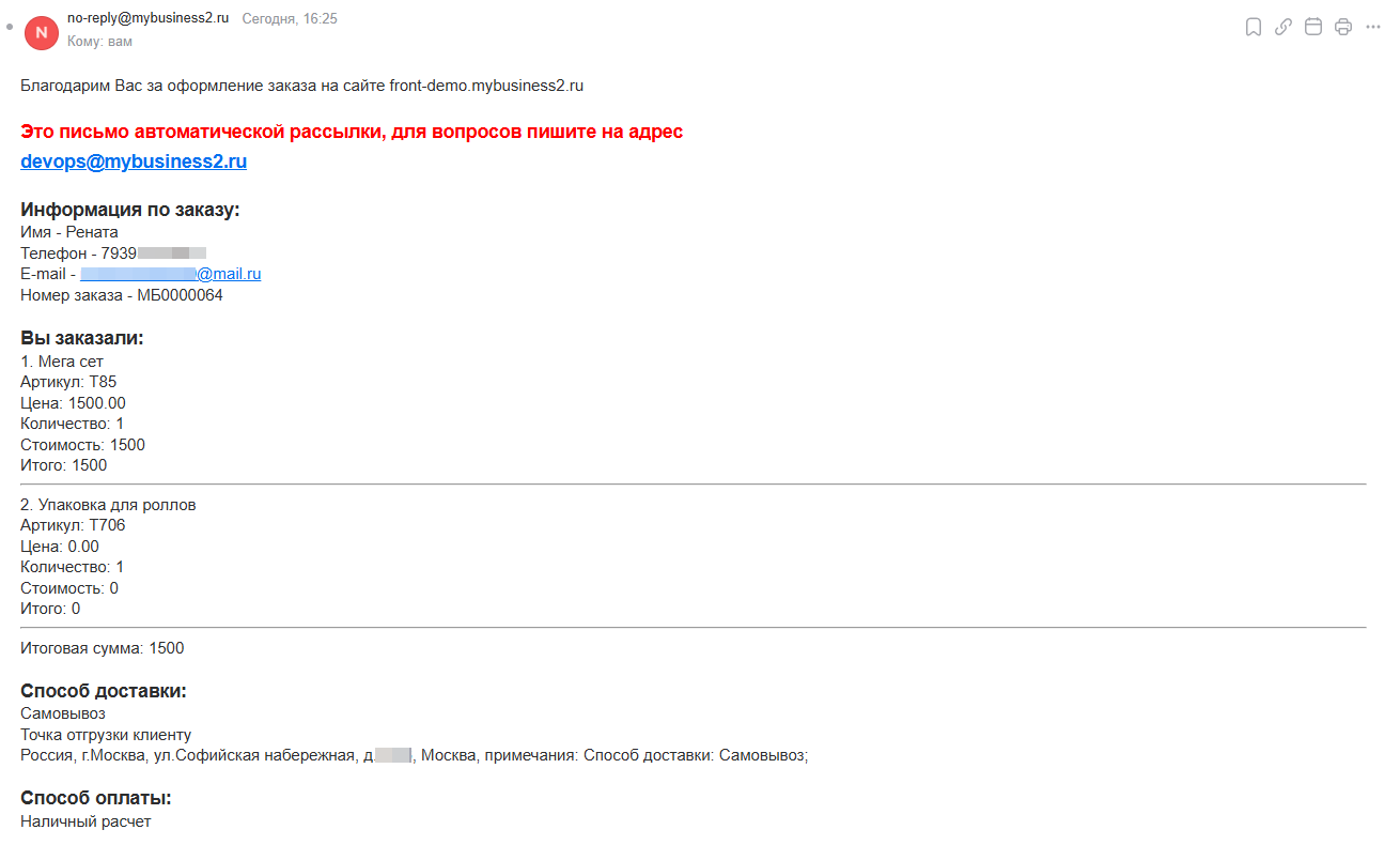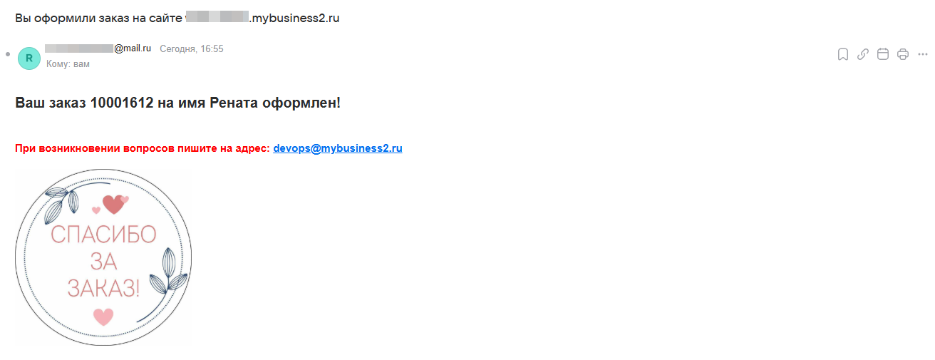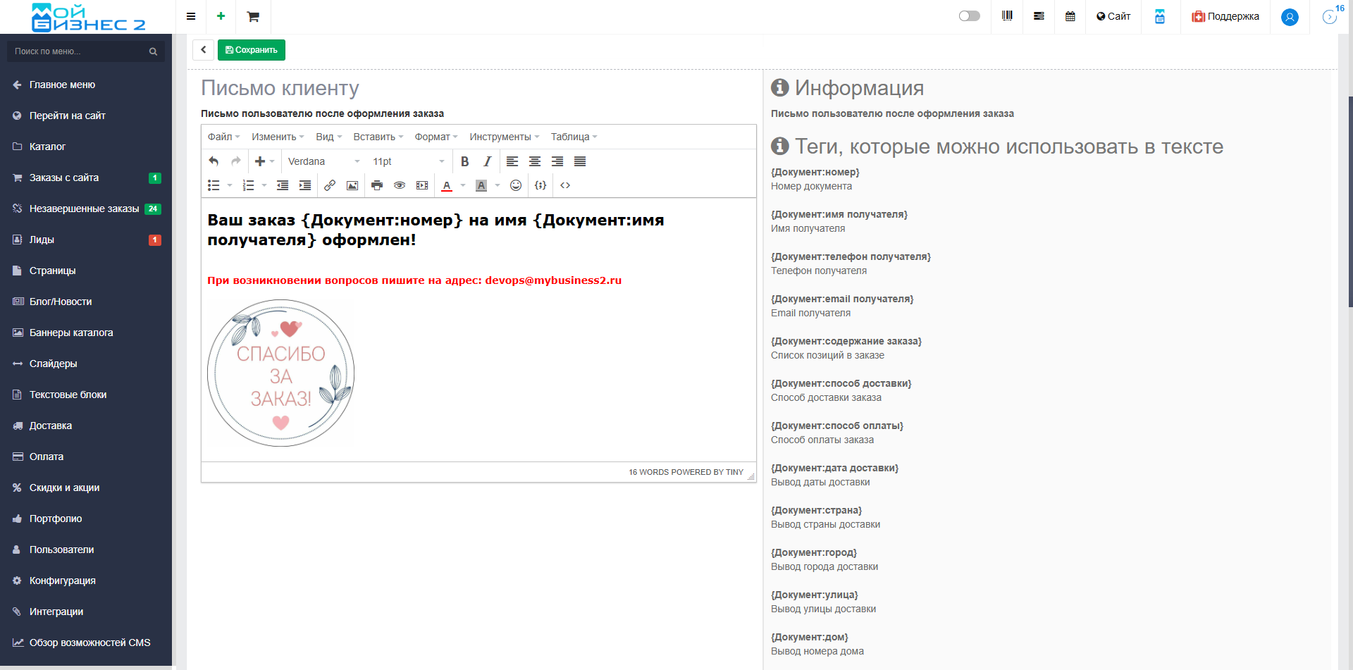 Вывод: таким образом, в МойБизнес2 есть возможность редактировать шаблон автоматического письма, отправляемого клиенту после успешного оформления заказа.