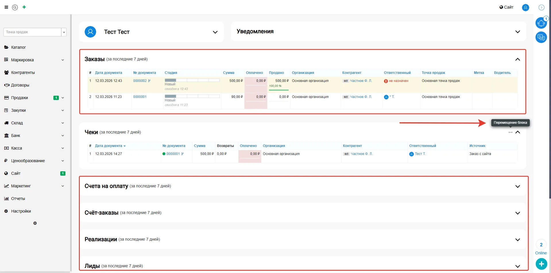 Уведомления: отображают события системы — например, информацию о новых заказах, оплате счетов или появлении задач.