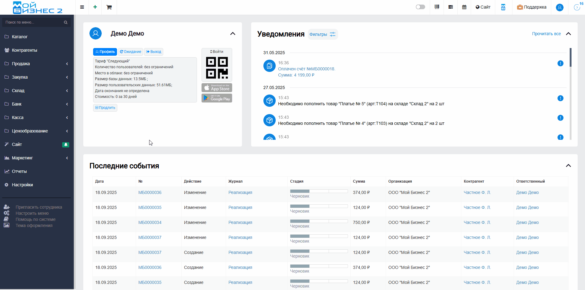 В МойБизнес2 есть возможность настроить зону доставки, а также сумму и время доставки для этой зоны.