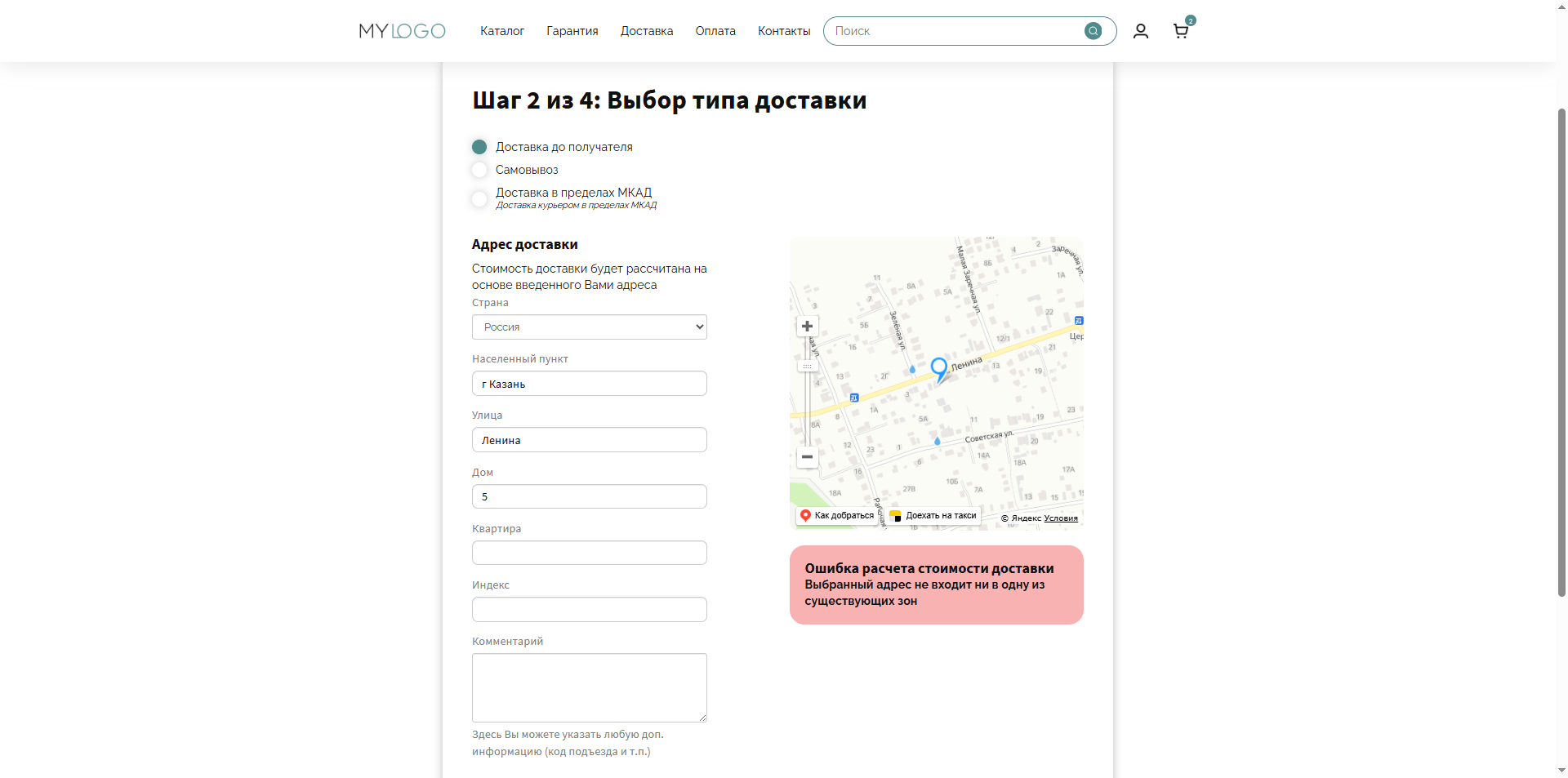 Скрин - оформление доставки на сайте