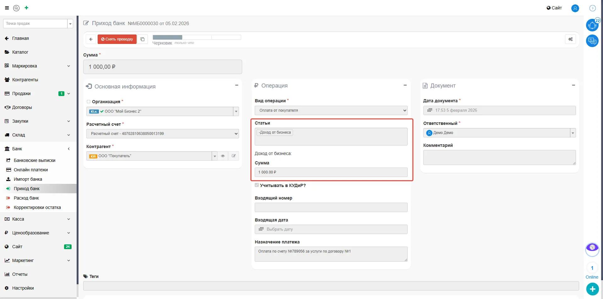 Теперь в МойБизнес2 вы можете назначать свои собственные статьи для любой банковской операции - созданной вручную или загруженной из банка. Настройте учет под свой бизнес и получайте детальную картину финансов.