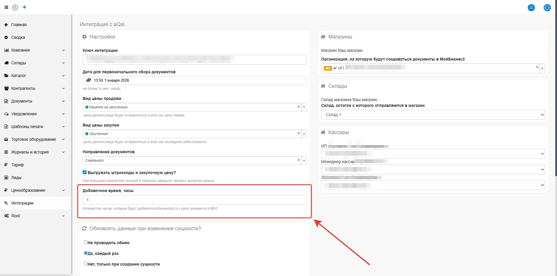 Доработали интеграцию: реализовали возможность указать кол-во часов к дате документов МойБизнес2, если часовый пояс отличается.