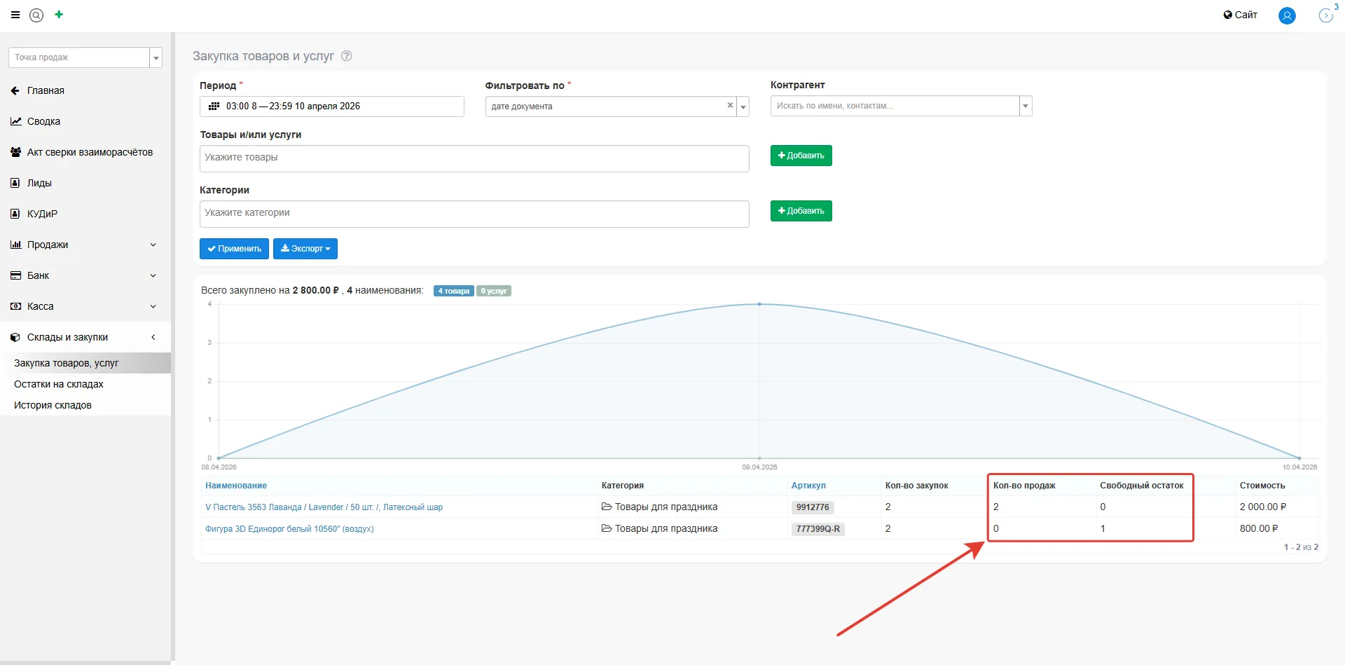 Доработали отчет по закупкам: добавили отображение кол-ва продаж и остатка на складе.