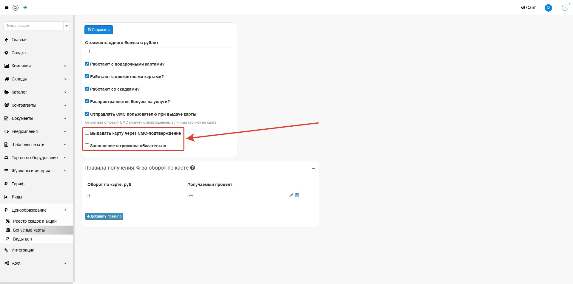 Доработали работу бонусных карт: теперь можно настроить, является ли обязательным штрихкод для карты и необходимо ли создавать бонусную карту с помощью СМС или без.