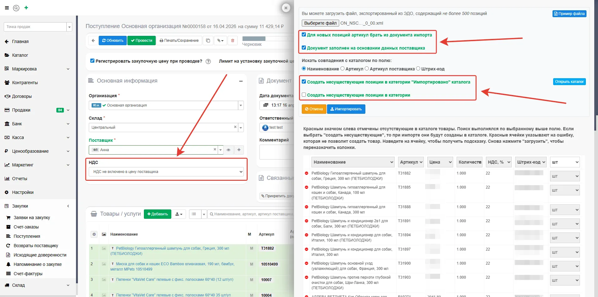 Доработали документ "Поступление", теперь доступен выбор НДС: без НДС, включено в стоимость поставщика, не включено в стоимость поставщика. Также, с помощью импорта в документе "Поступление" можно выбирать в какие категории будут созданы несуществующие товары, а при создании импорта из ЭДО можно указать создание артикула согласно файлу и то, что документ заполнен на основании данных поставщика.