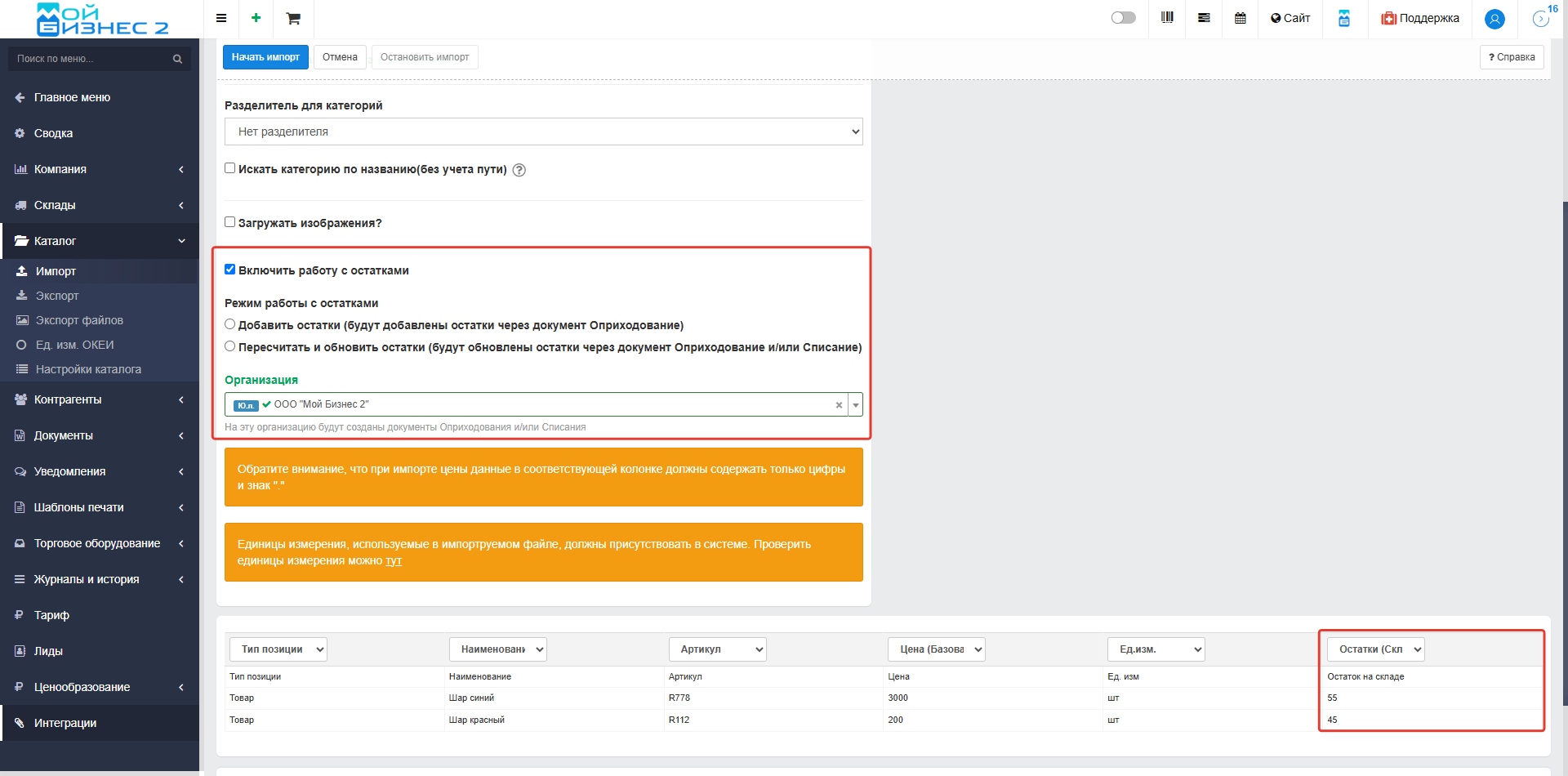3. Выбор операции с остатками при импорте каталога