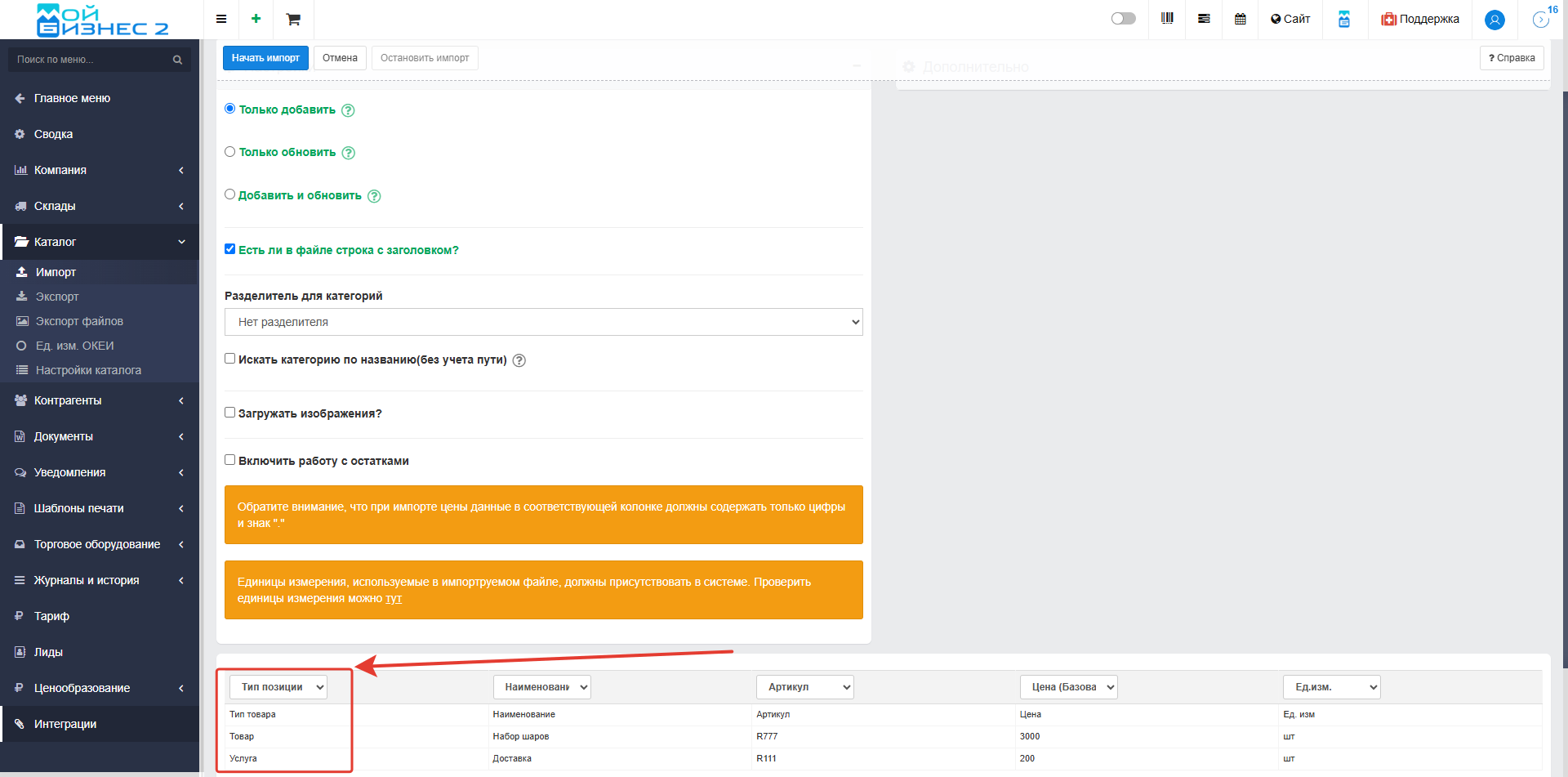 2. Указание типа позиции при импорте каталога