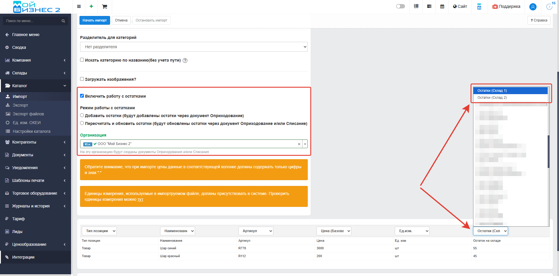 4. Указание склада для операций с остатками при импорте каталога