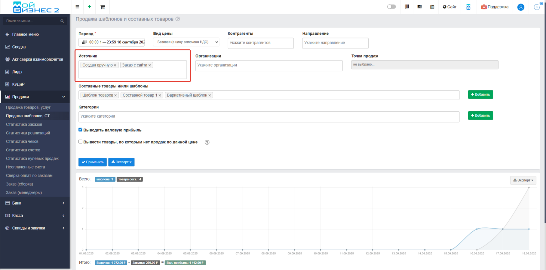 7. Фильтр "Источник" в отчете по продаже шаблонов и составных товаров
