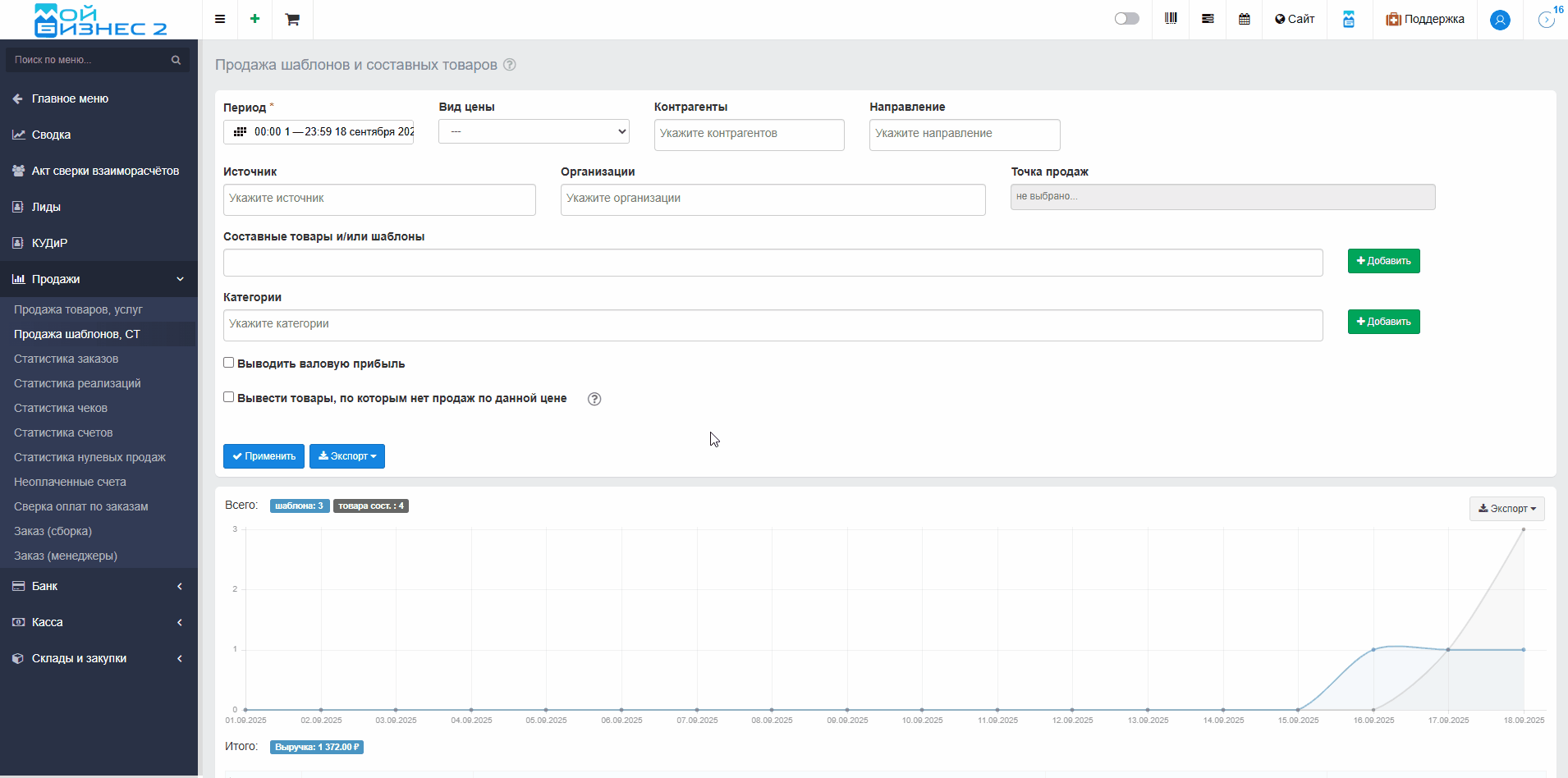 Вывод: МойБизнес2 предоставляет удобную возможность для формирования отчета по продажам шаблонов и составных товаров. На данной странице пользователь может сформировать отчет о статистике продаж, основанный на информации из чеков.