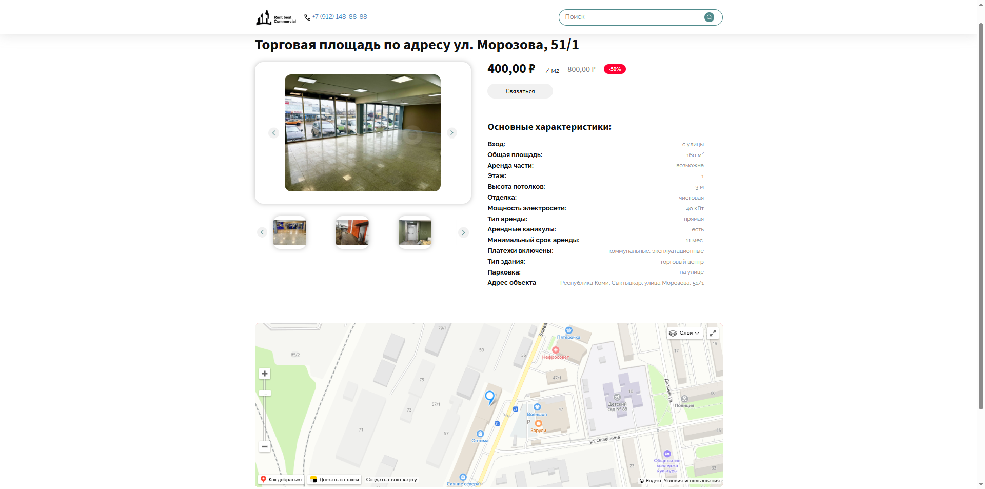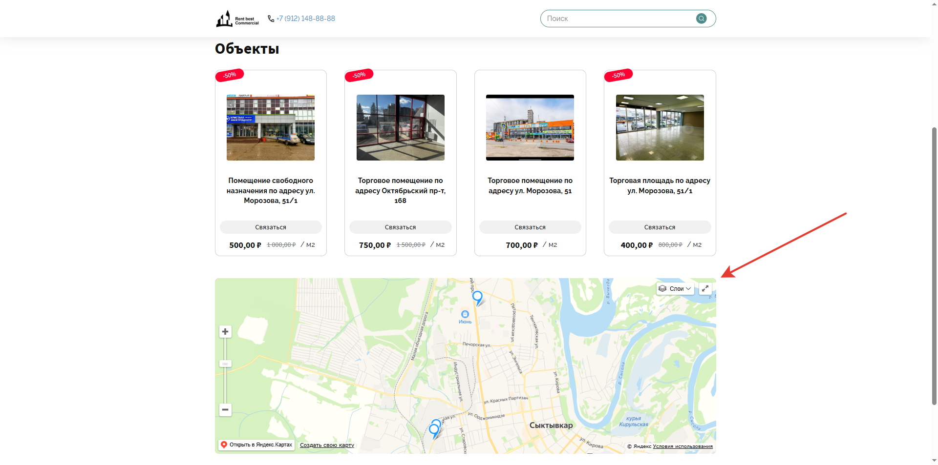 Рассмотрим, как это работает на сайте. Например, для помещения свободного назначения в торговом центре: при переходе в карточку объекта на сайте автоматически отображается его точное местоположение на карте, что позволяет потенциальным арендаторам визуально оценить локацию.