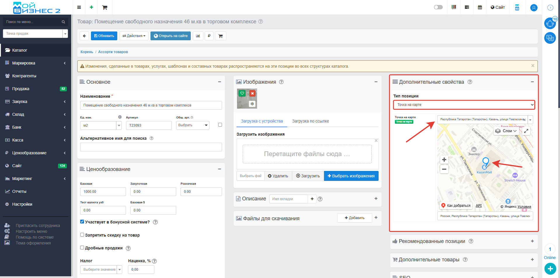 Для добавления точки на карту в карточке товара, услуги, шаблона или составного товара необходимо в блоке "Дополнительные свойства" выбрать свойство типа "Точка на карте", после чего указать местоположение непосредственно на интерактивной карте или ввести адрес вручную в соответствующее поле.