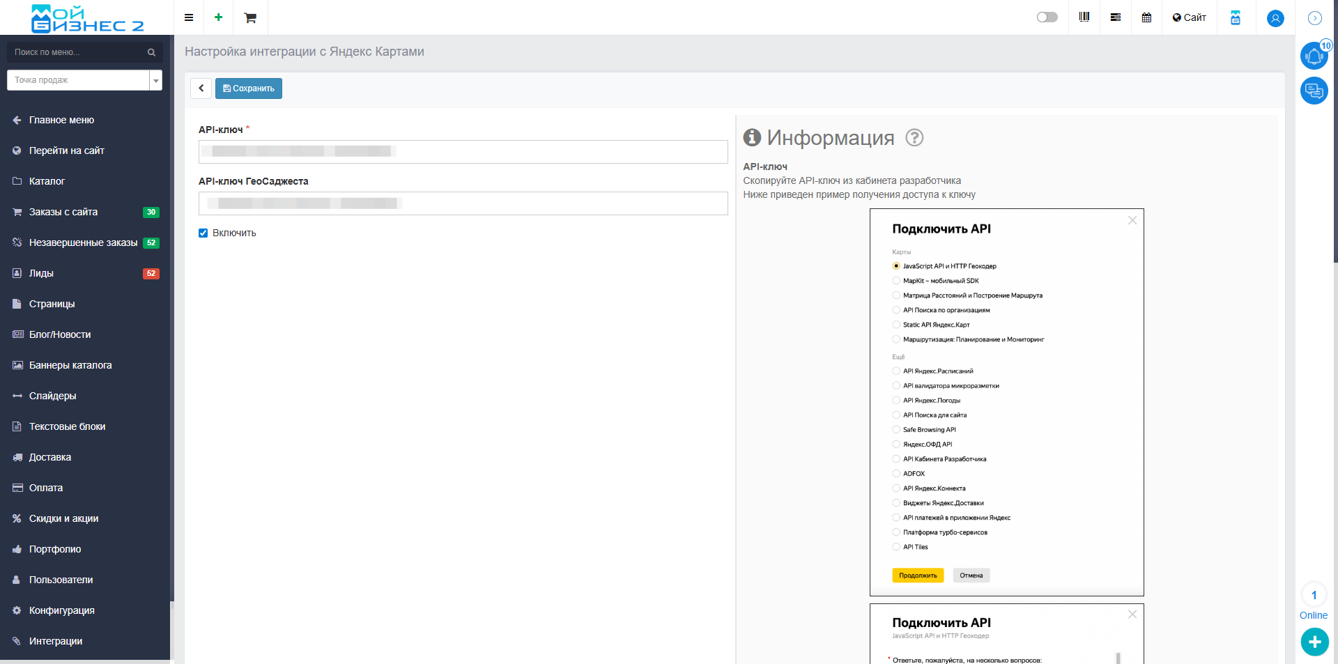 Скрин - страница настройки интеграции с Яндекс.Картами
