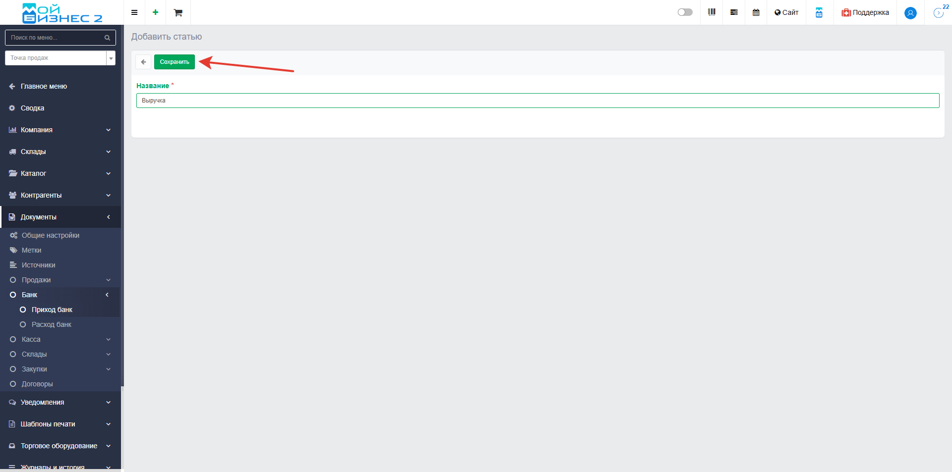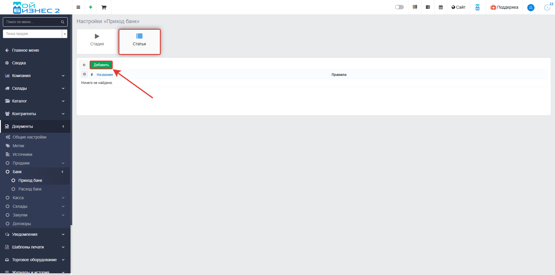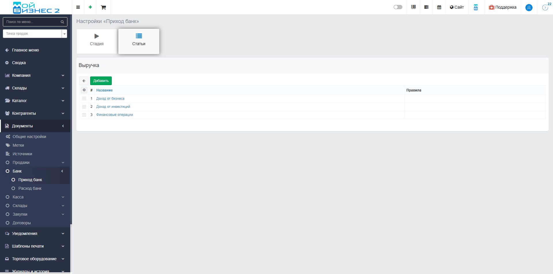 Для создания статьи доходов (например, "Выручка") перейдите во вкладку "Статьи" и нажмите кнопку "Добавить":