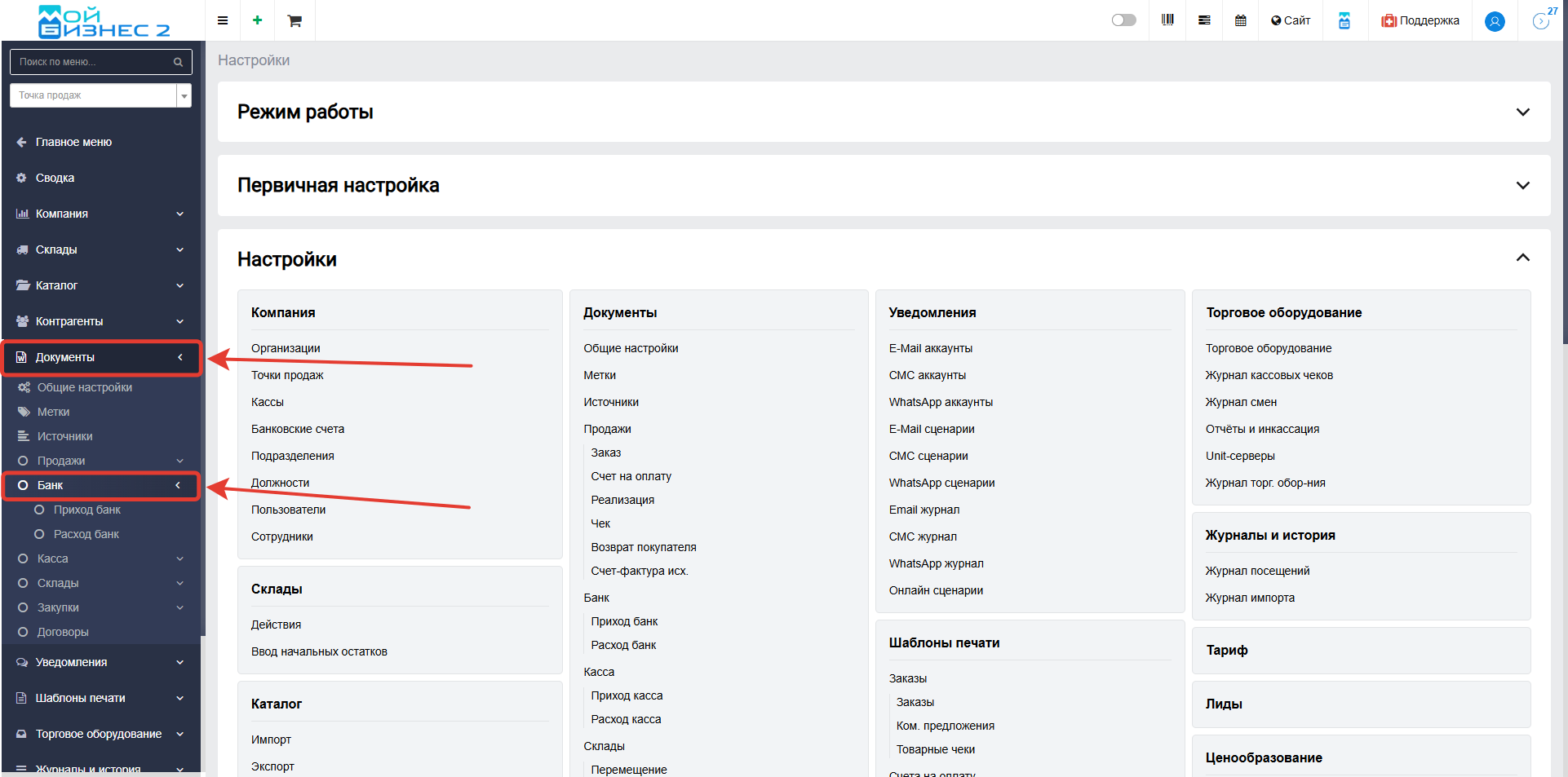 Скрин - переход в раздел "Настройки" - "Документы" - "Банк"