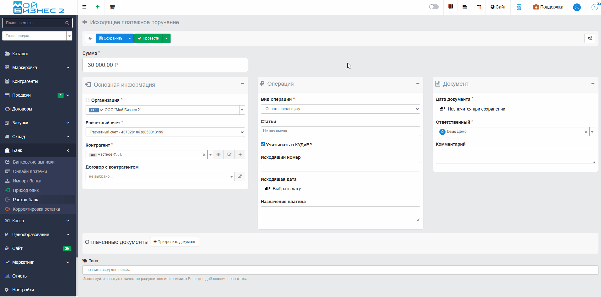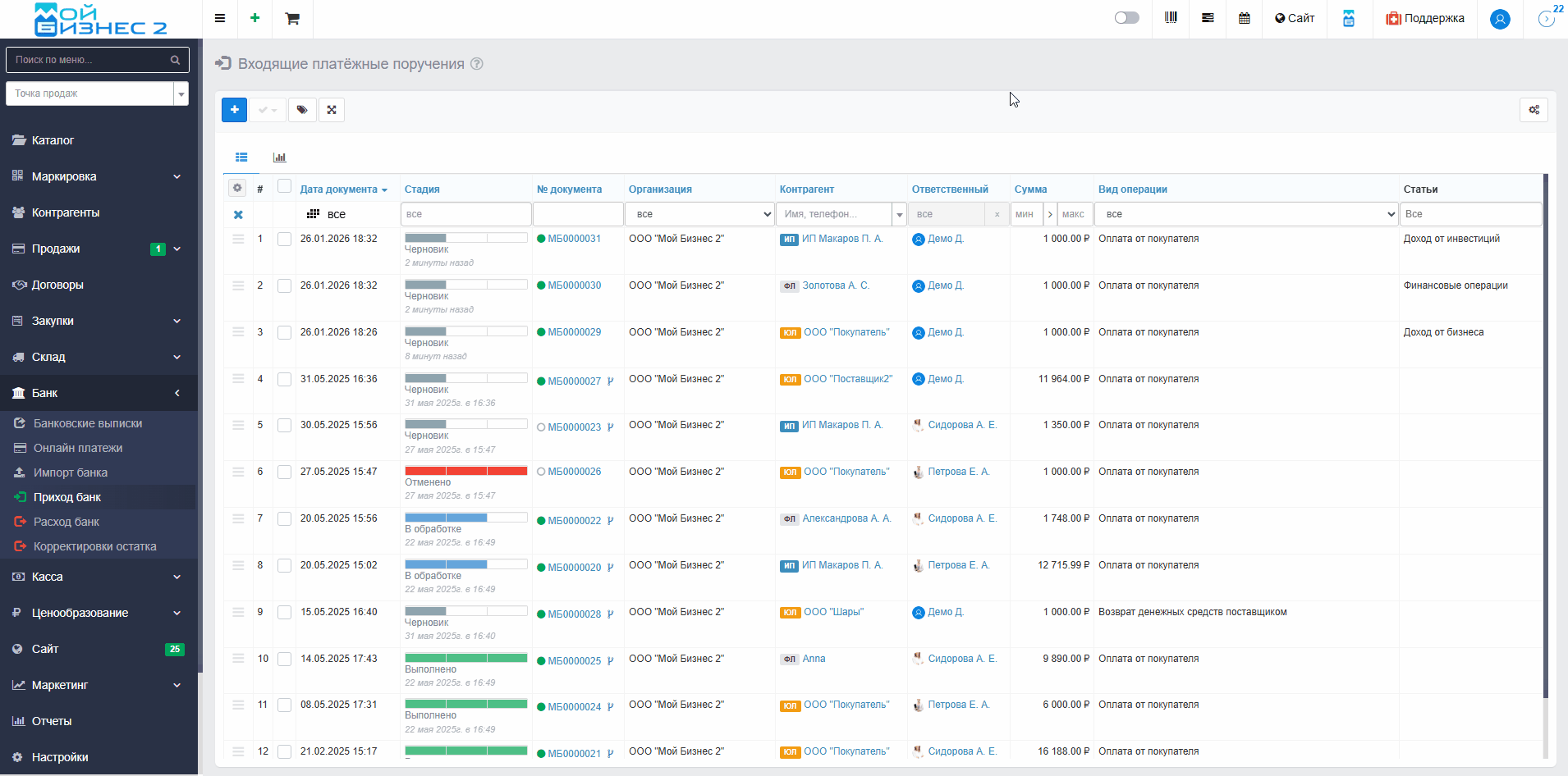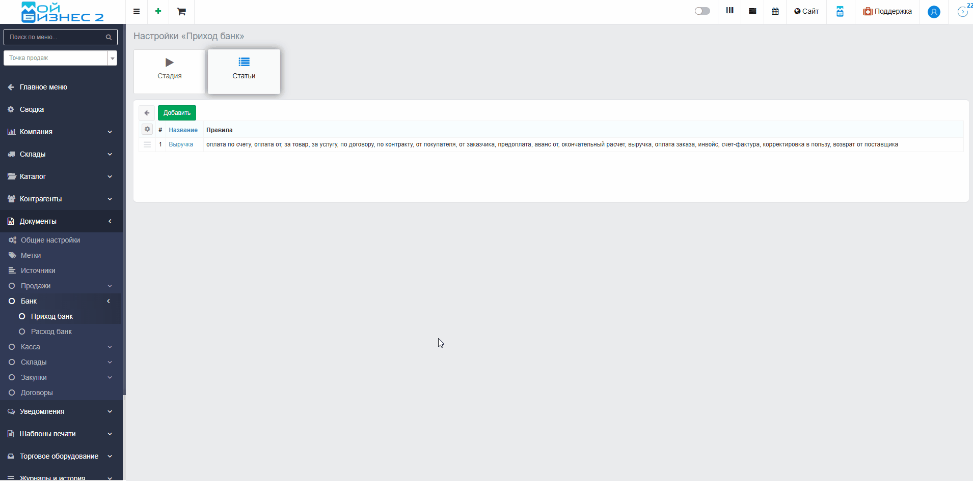Вывод: таким образом, МойБизнес2 позволяет гибко настраивать статьи и подстатьи для классификации банковских операций, назначать их как вручную, так и автоматически при импорте банка - через правила на основе ключевых фраз в назначении платежа, что обеспечивает точный и эффективный учёт доходов и расходов.