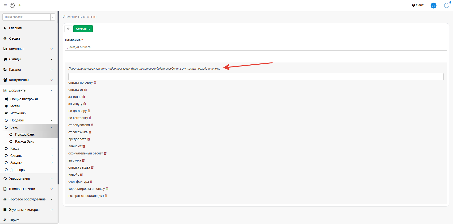 Кроме того, для автоматической классификации платежей можно задать набор ключевых поисковых фраз, разделенных запятыми, например: "оплата по счету", "предоплата от", "выручка", "заказ №". Это необходимо для работы с импортом банковских платежей.