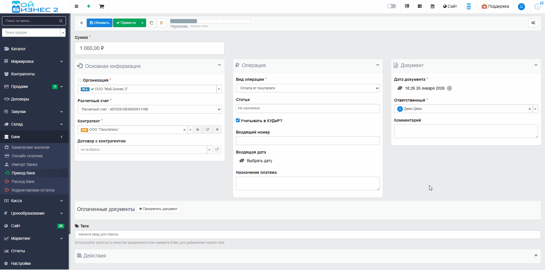 3.1. Документ "Приход банк"