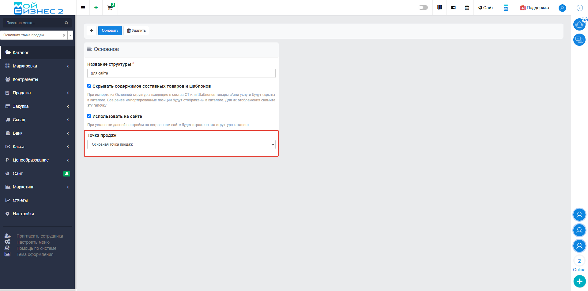 Данная настройка позволяет связать структуру каталога с одной из точек продаж, если их в системе несколько. Эта связь носит информационный характер и определяет, какая структура будет показана при применении фильтра по точке продаж.