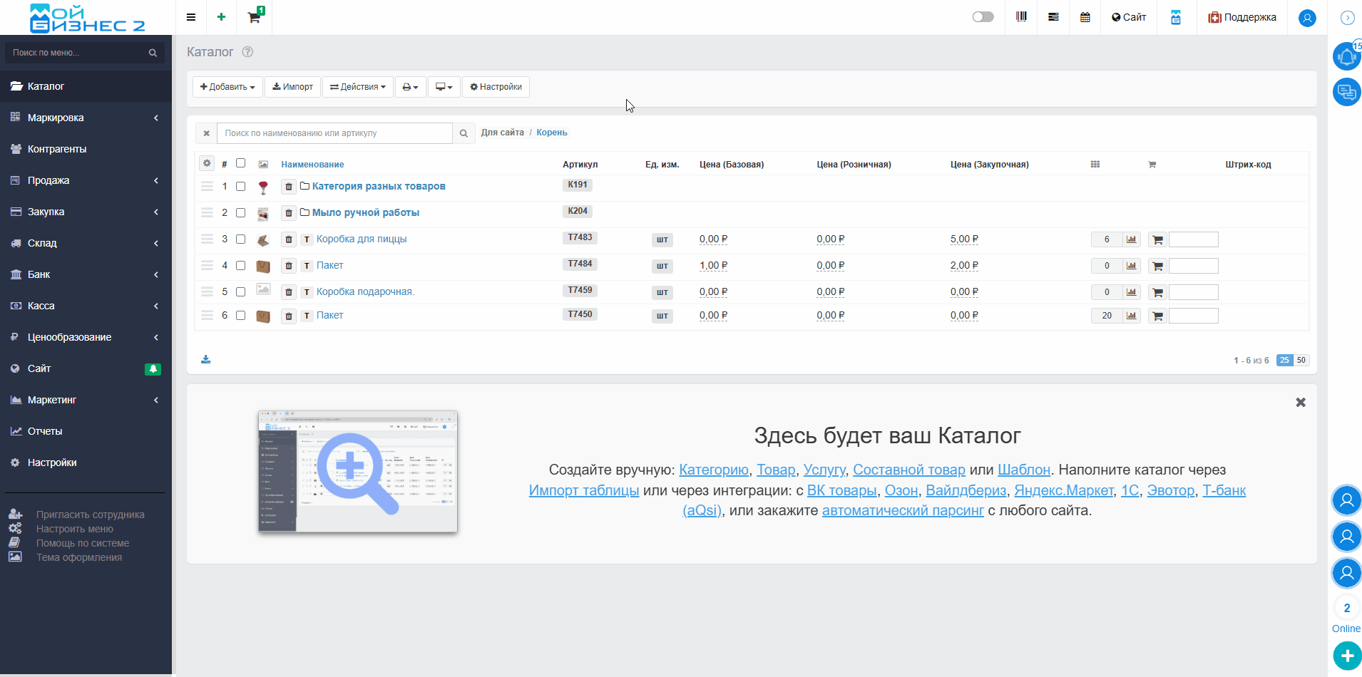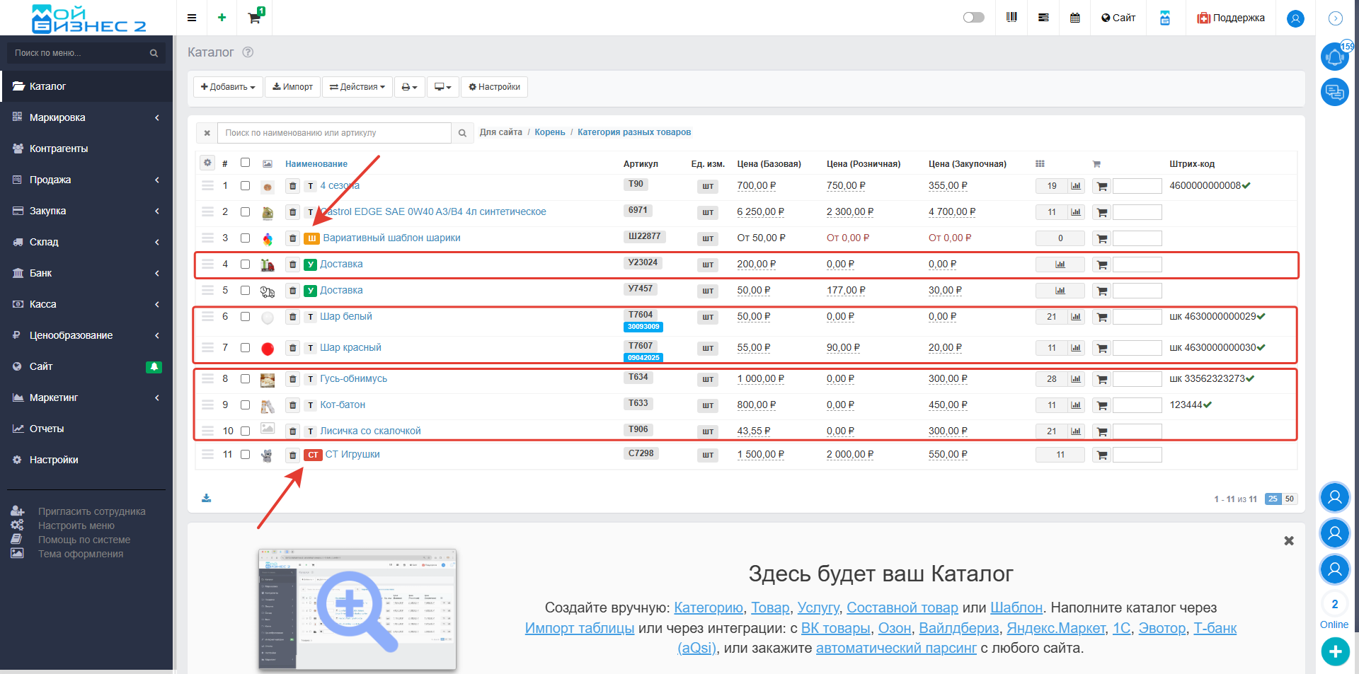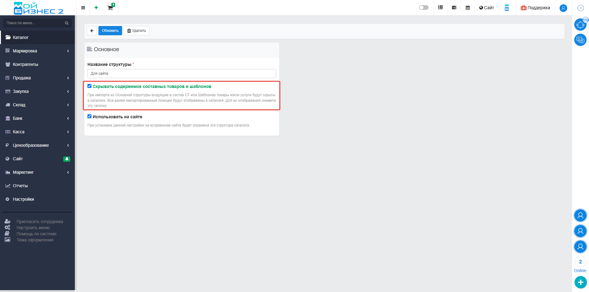 Вывод: таким образом, в МойБизнес2 можно создавать и настраивать структуры каталога, в том числе управлять их отображением на сайте и скрывать компоненты составных товаров и шаблонов.